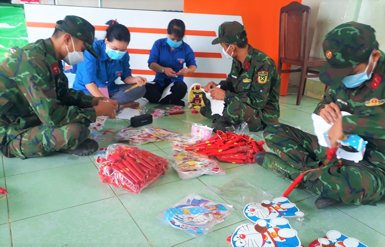 Đoàn viên, thanh niên Trung đoàn 5 và Quận 12 làm lồng đèn cho các cháu thiếu nhi.