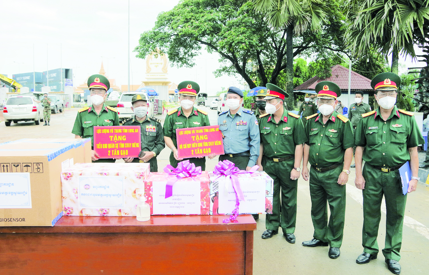 Thời điểm dịch Covid - 19 bùng phát mạnh bên nước bạn, với phương châm giúp bạn là tự giúp mình, các đơn vị LLVT tỉnh Long An có các hoạt động giúp đỡ quân đội nước bạn chống dịch như tặng khẩu trang, dung dịch khử khuẩn, bộ test nhanh…