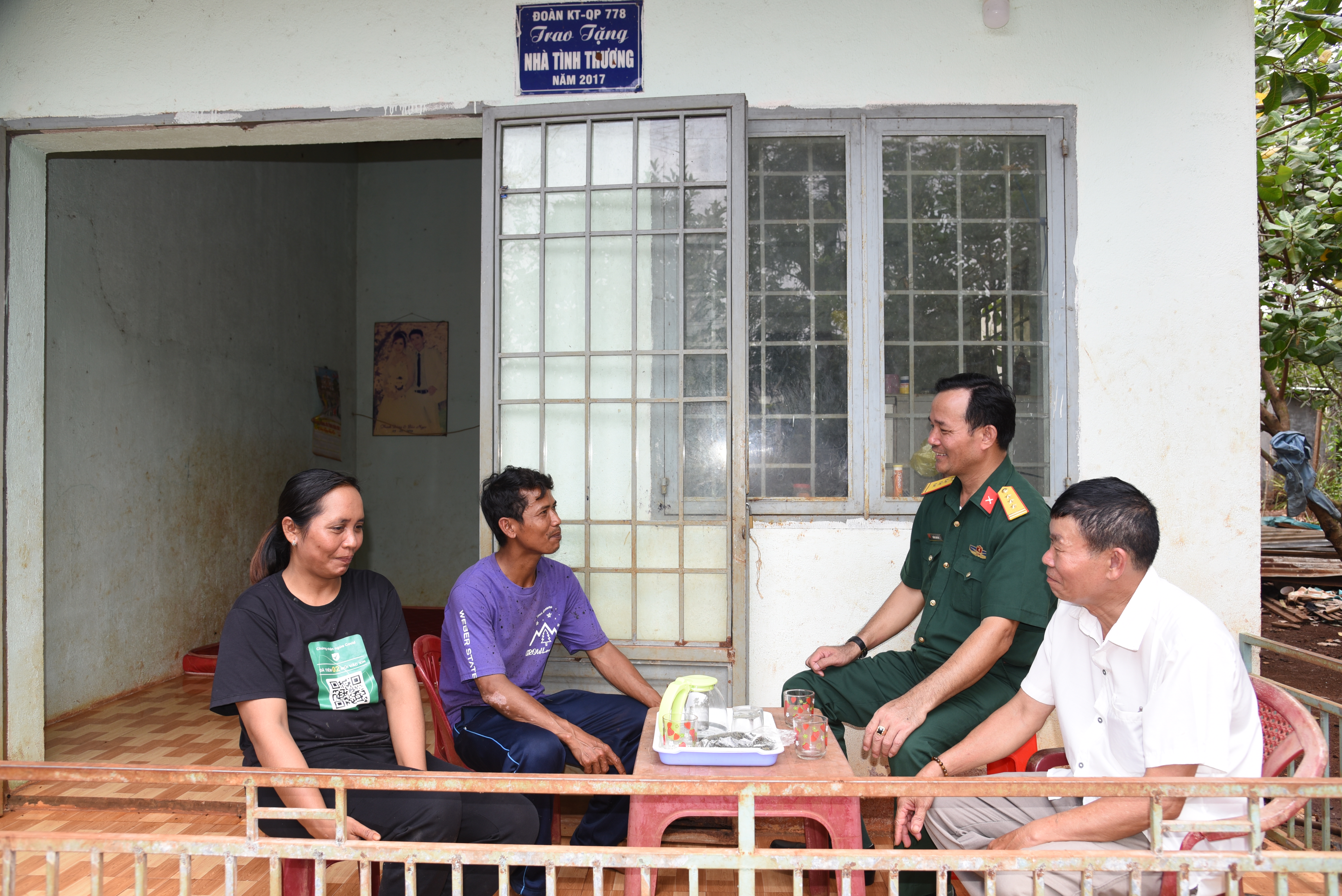 Vợ chồng ông Điểu Dũng trò chuyện với cán bộ Đoàn KT-QP778 trước căn nhà của mình tại Khu dân cư Tiểu khu 119.