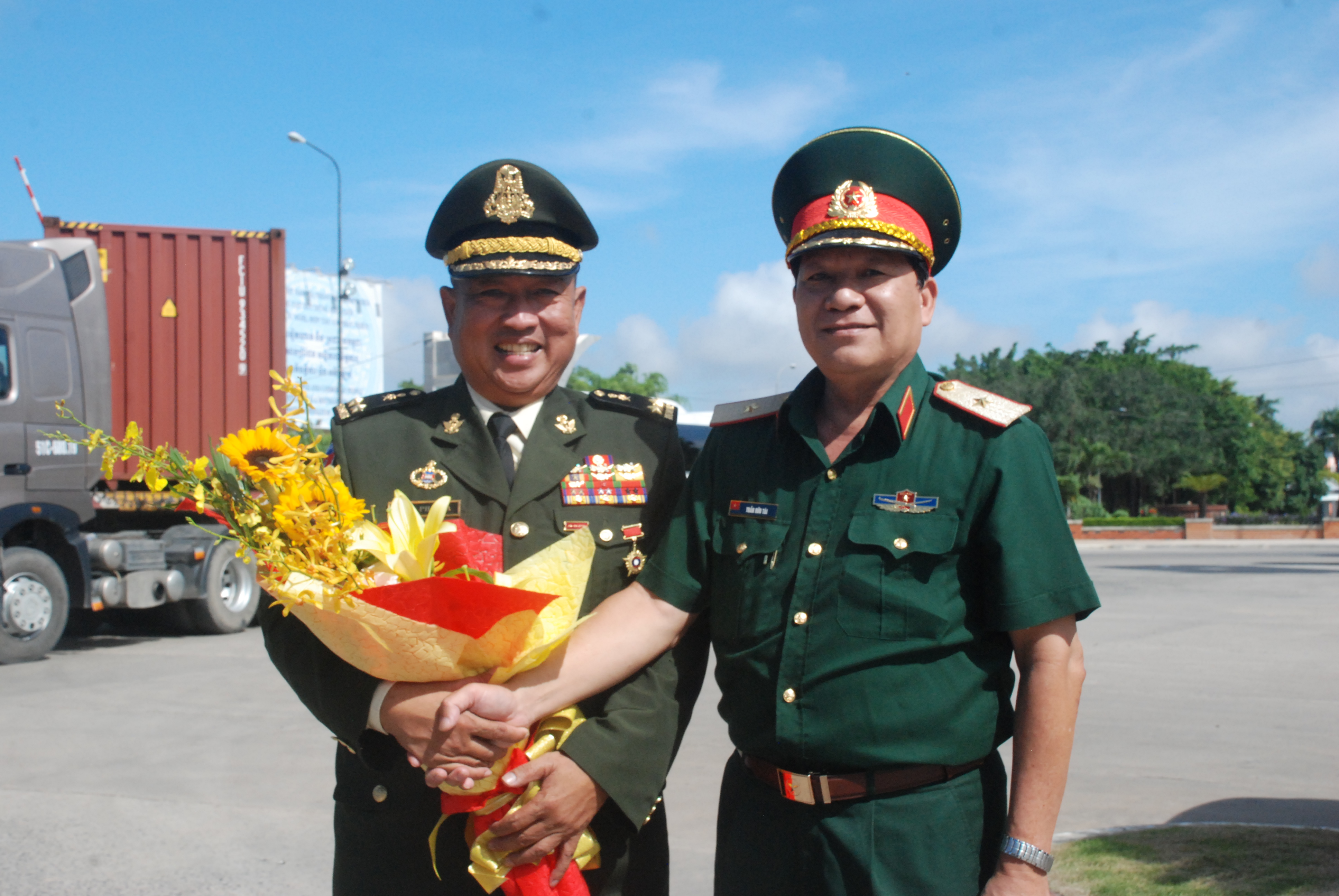 Thiếu tướng Trần Hữu Tài, Phó Chủ nhiệm Chính trị QK7 tặng hoa cho đoàn tại cửa khẩu quốc tế Mộc Bài