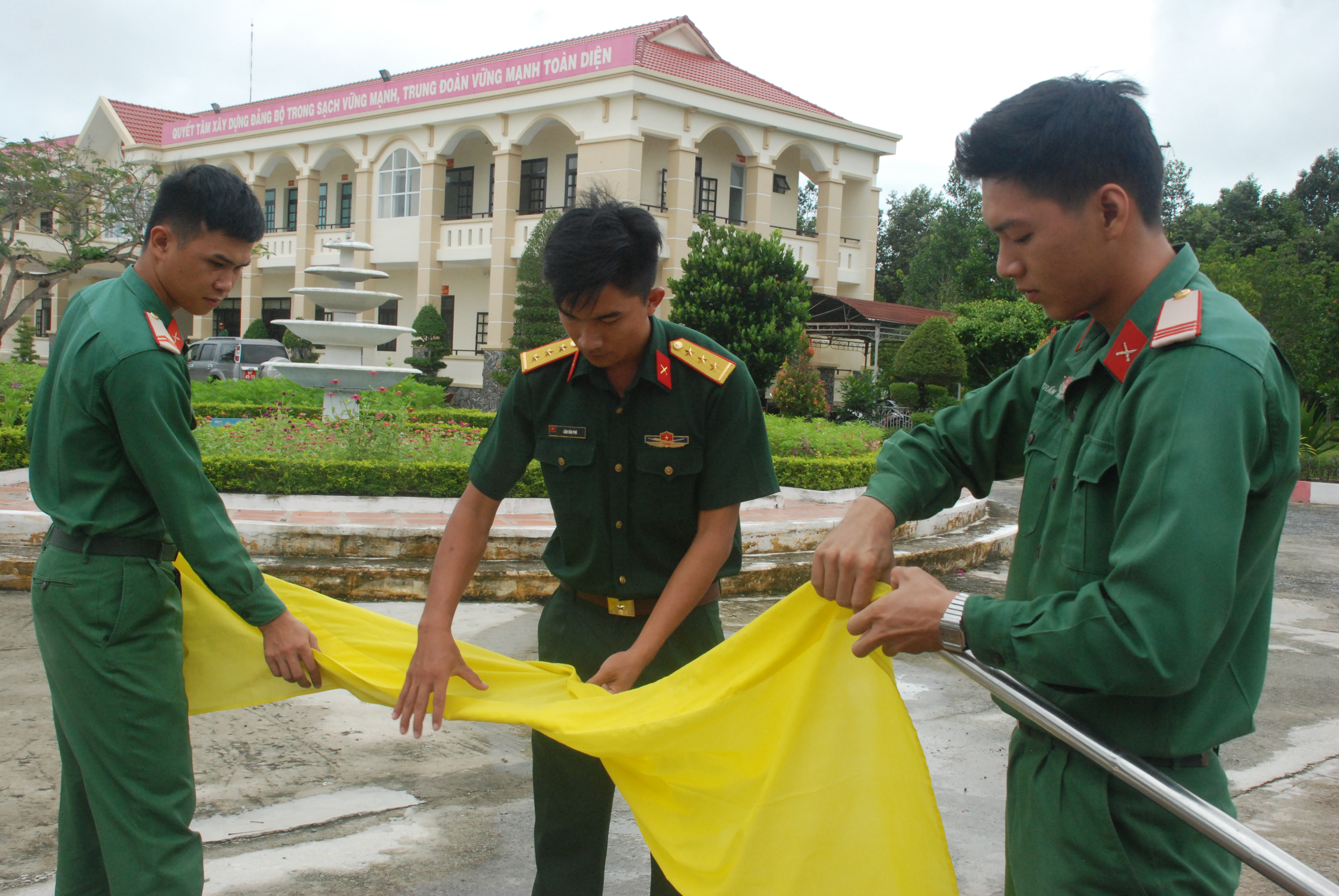 Cán bộ, chiến sĩ Trung đoàn trang trí cờ xung quanh đơn vị