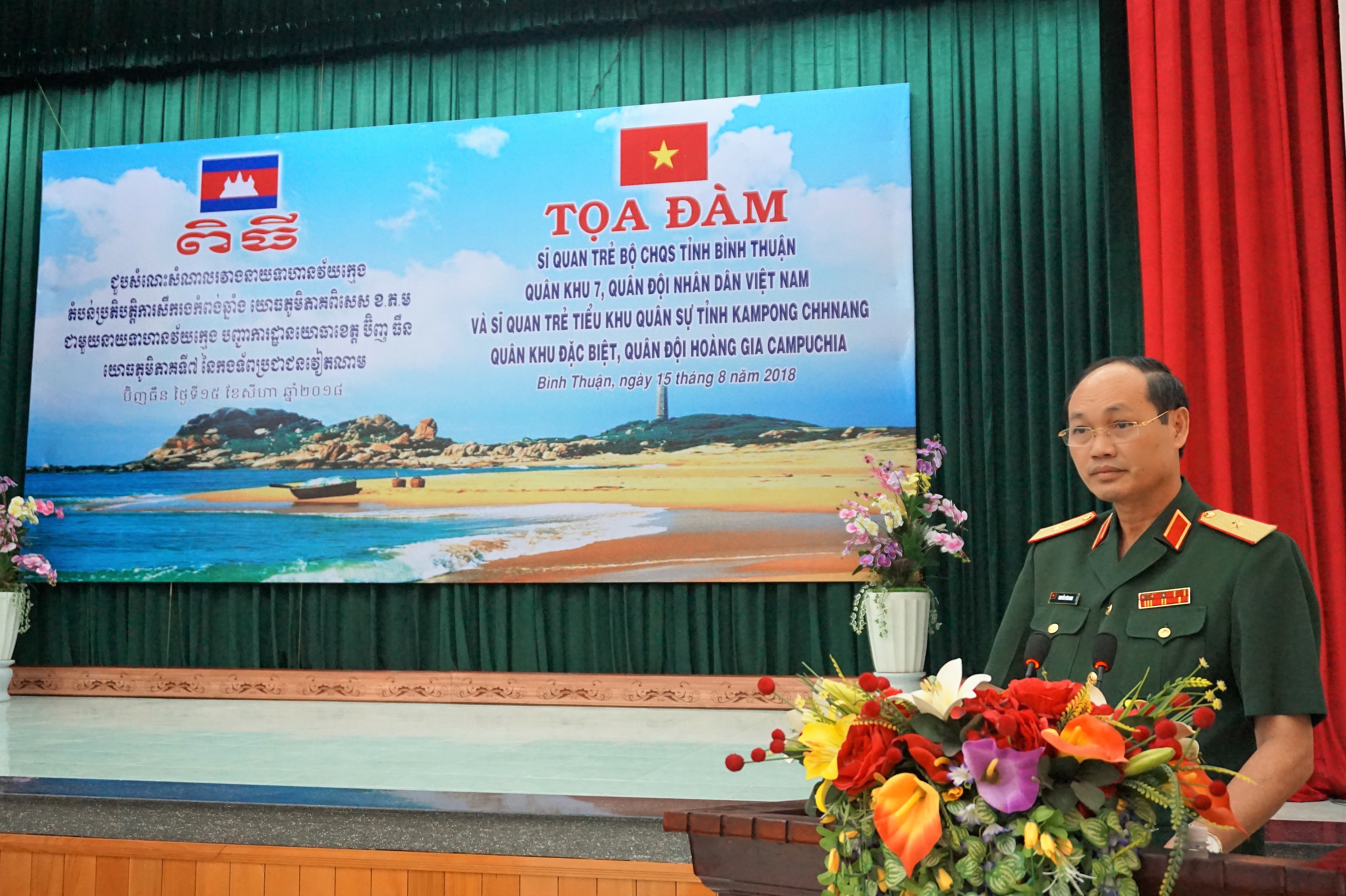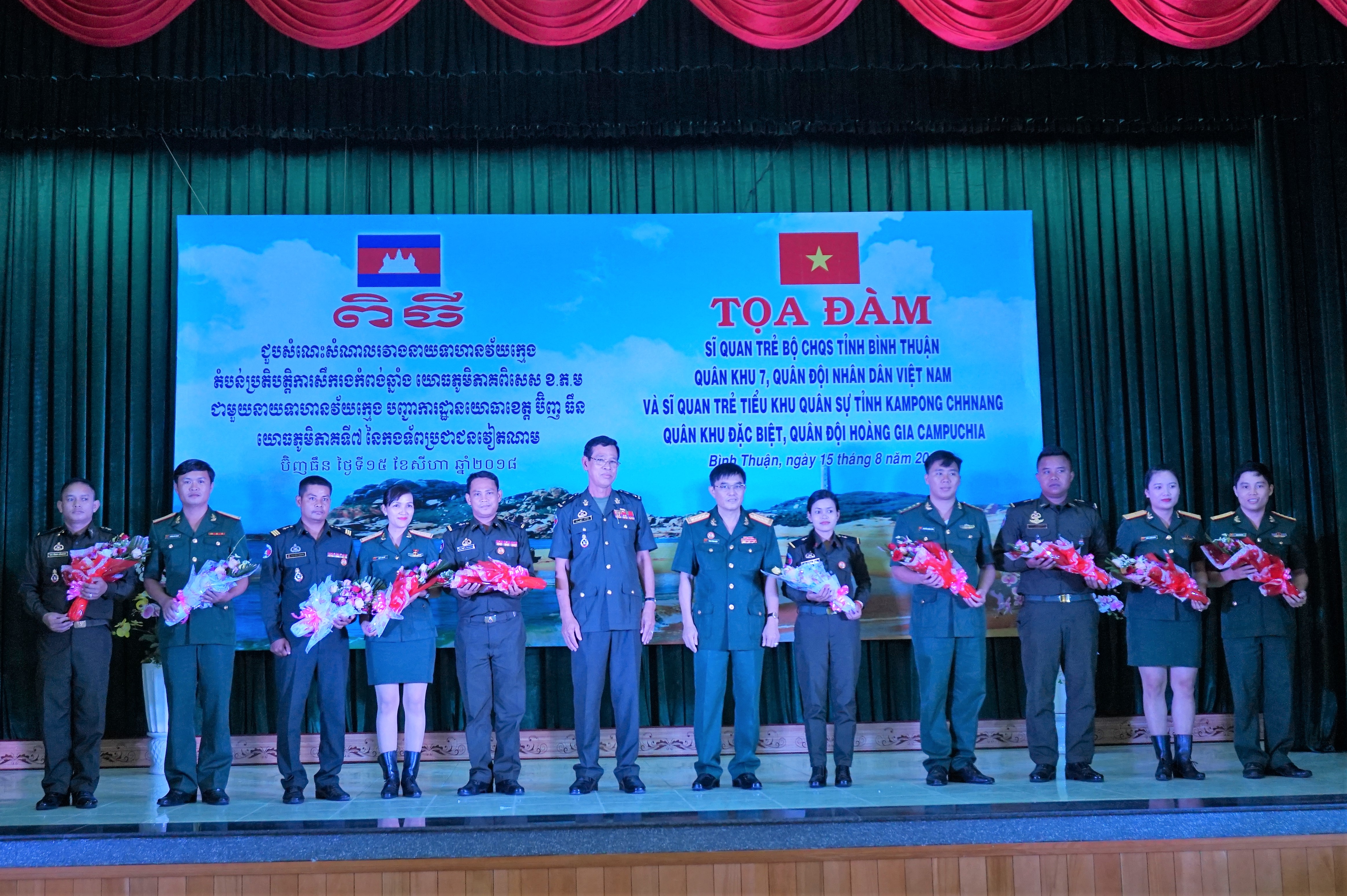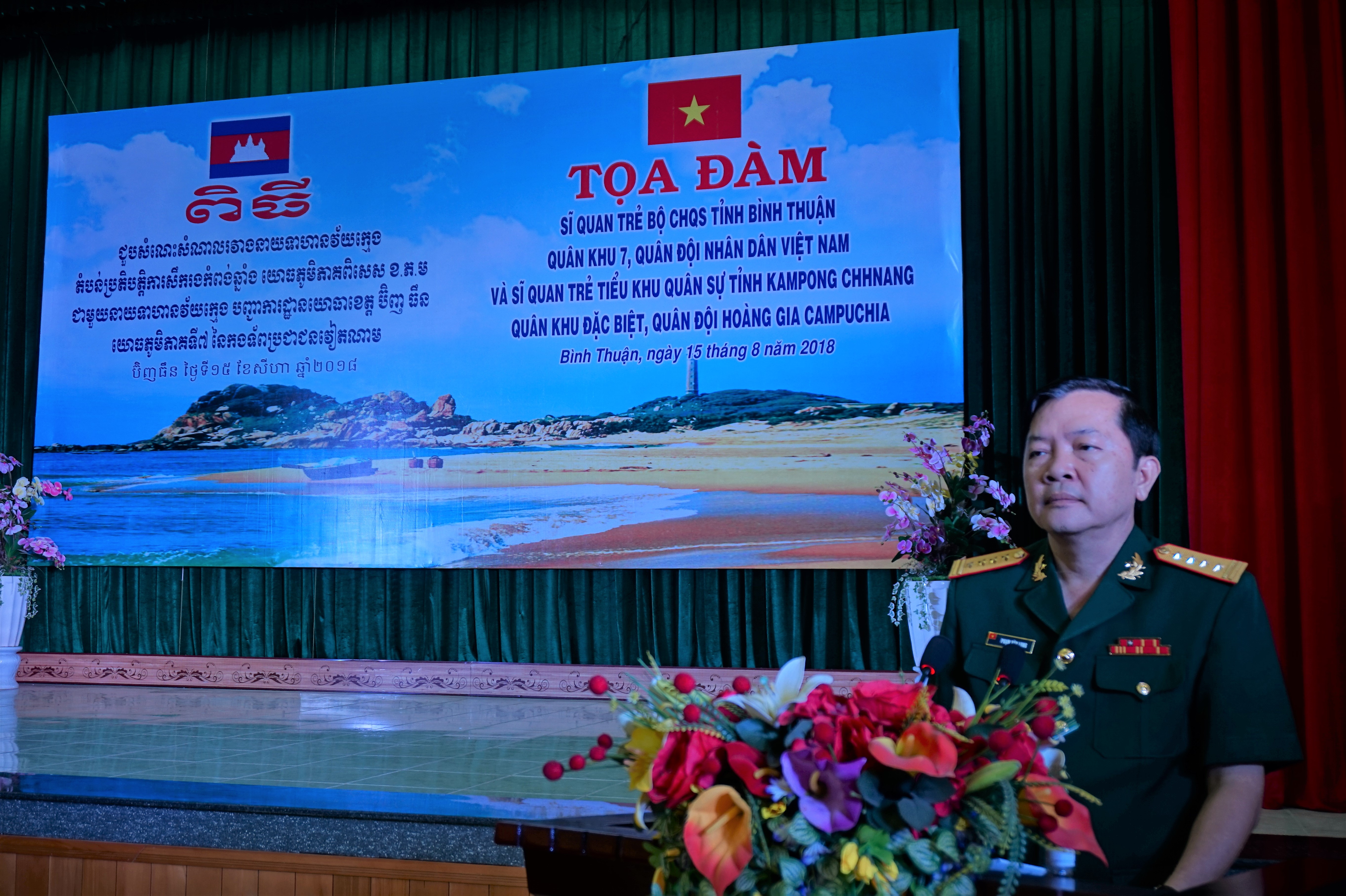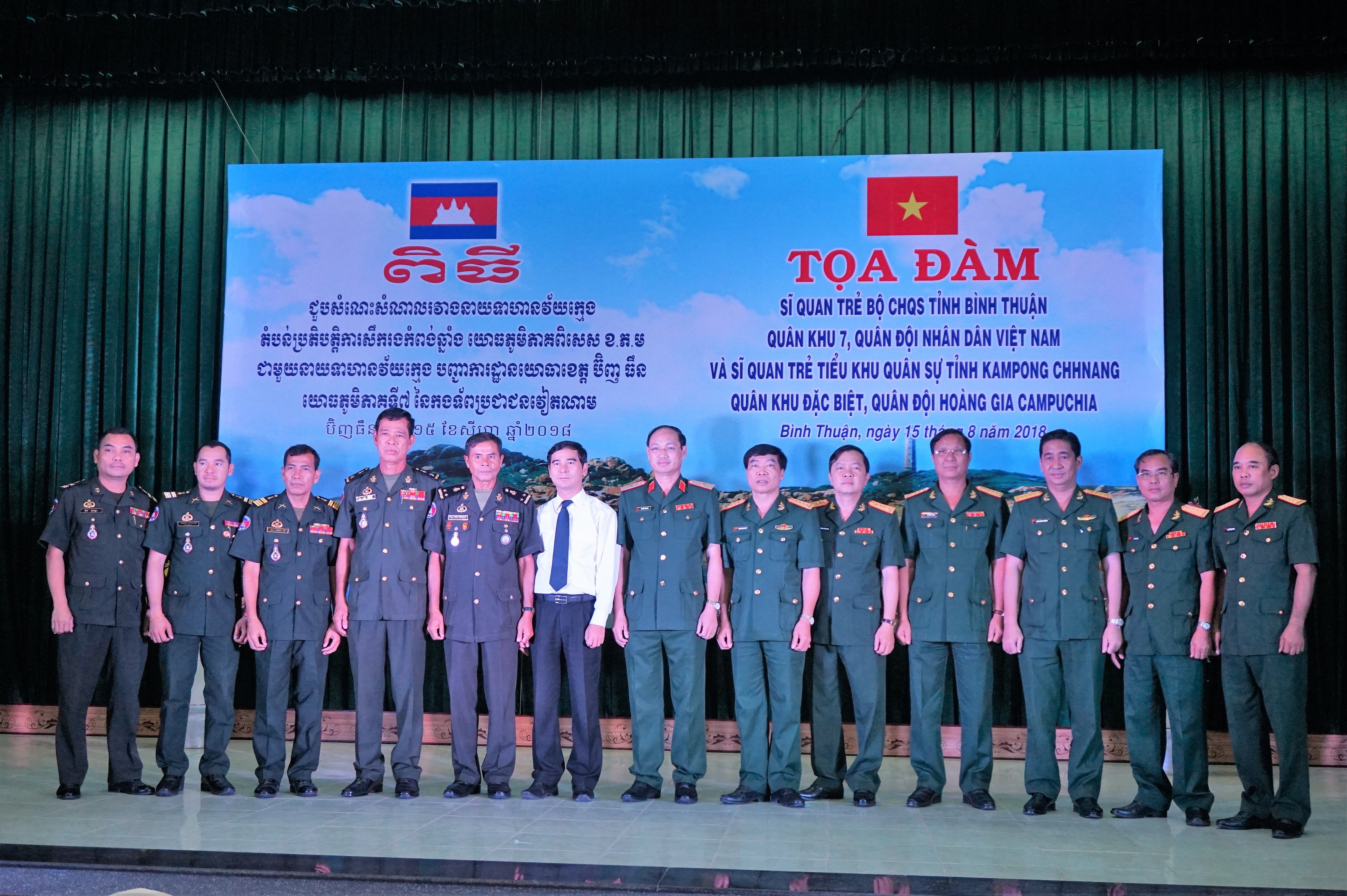 (QK7 Online) - Ngày 15/8/2018, Bộ CHQS tỉnh Bình Thuận, Quân khu 7, Quân đội nhân dân Việt Nam phối hợp với Tiểu khu Quân sự tỉnh Kampong Chhnang, Quân khu Đặc biệt, Quân đội Hoàng gia Campuchia tổ chức buổi tọa đàm sĩ quan trẻ với chủ đề “Đoàn kết, hữu nghị, chung tay xây dựng và phát triển”.