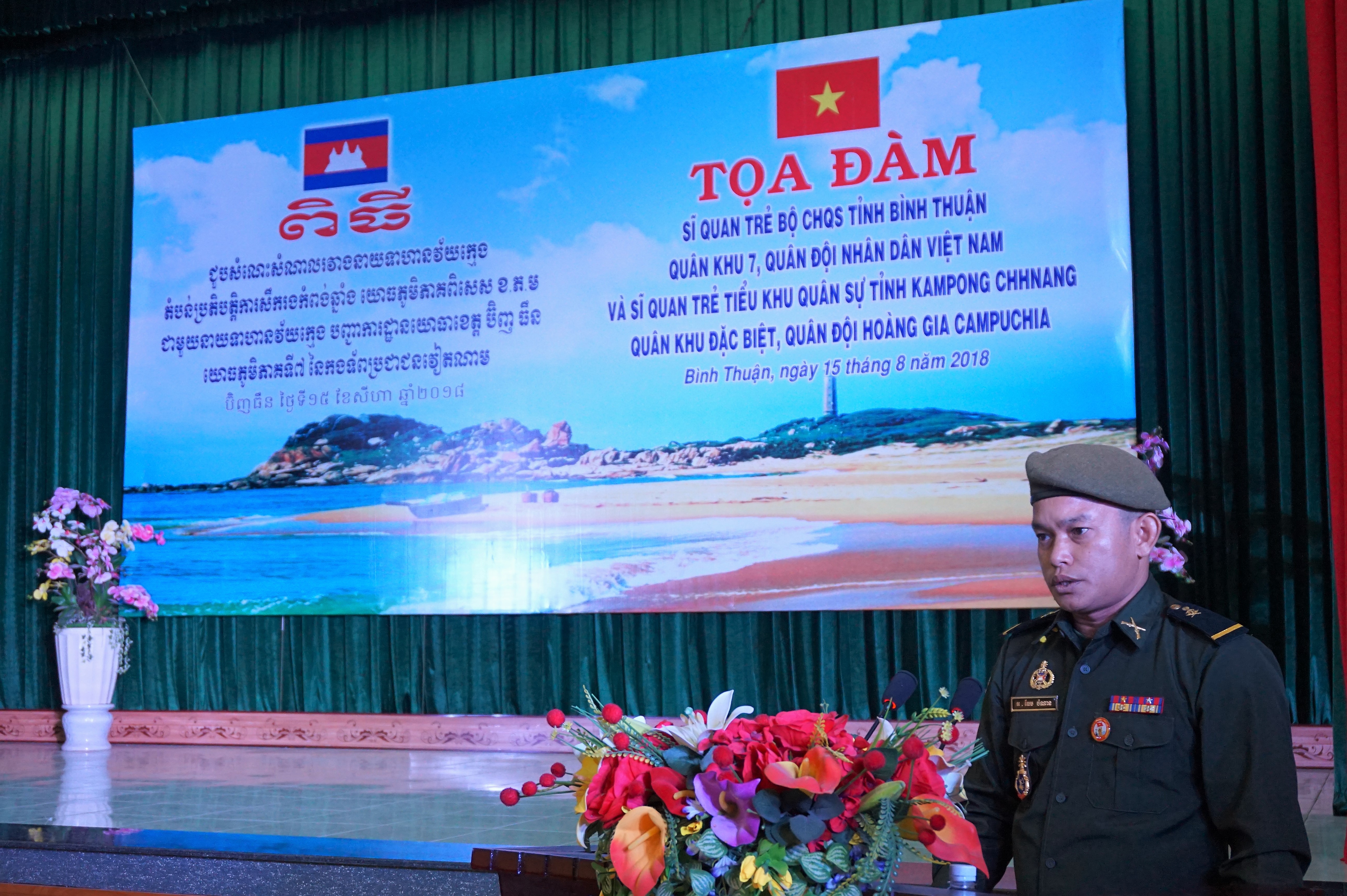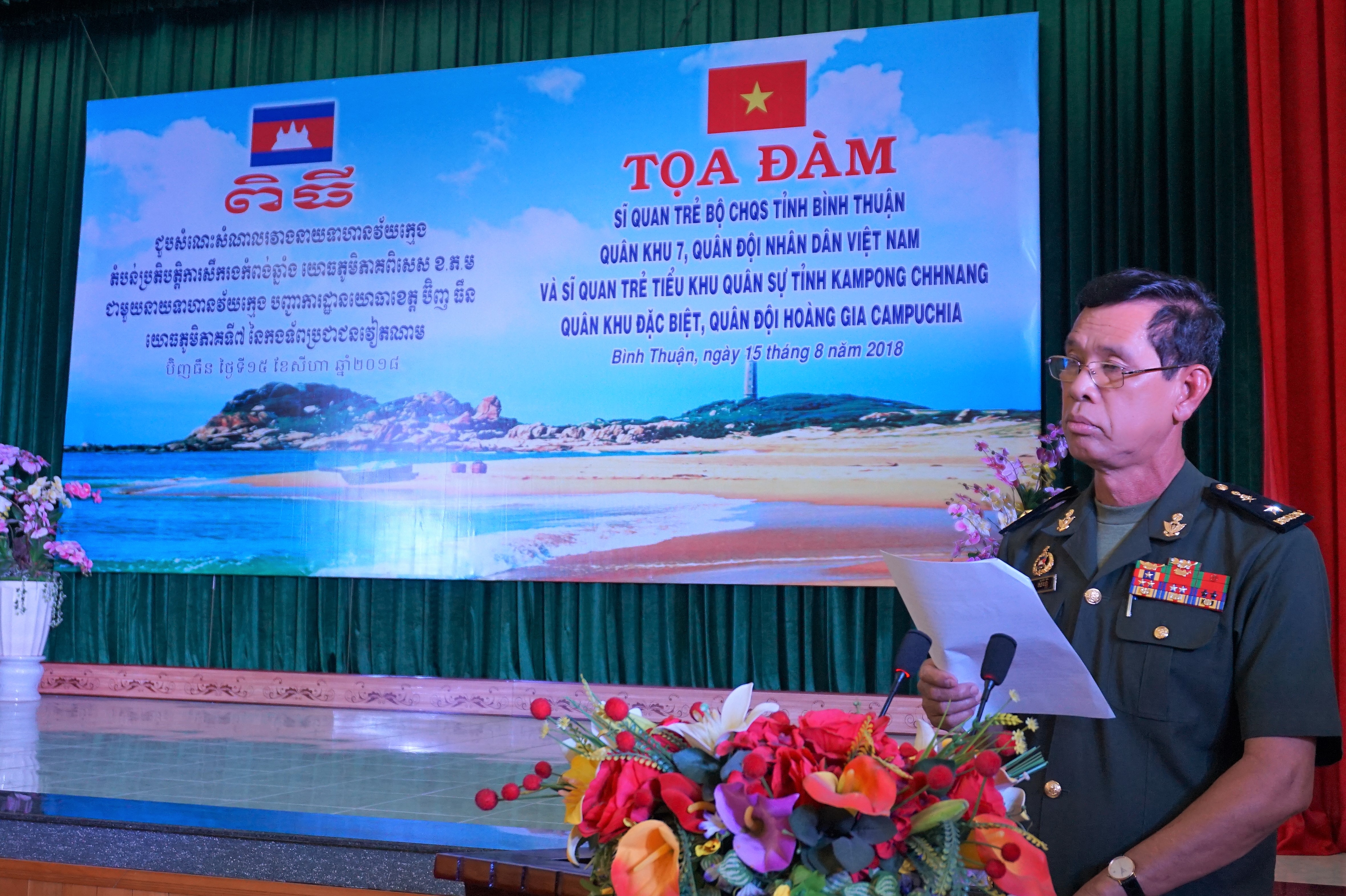 Thiếu tướng Nou Samreth, Phó chỉ huy trưởng Tiểu khu quân sự tỉnh Kampong Chhnang, Quân khu Đặc biệt, Quân đội Hoàng gia Campuchia gửi lời cảm ơn sâu sắc trước tình cảm nồng hậu, sự hỗ trợ nhiệt tình Quân đội nhân dân Việt Nam, đặc biệt là Bộ Tư lệnh Quân khu 7, Tỉnh Bình Thuận dành cho Quân đội Hoàng gia Campuchia và Tiểu khu Quân sự tỉnh Kampong Chhnang. Thiếu tướng Nou Samreth cho biết cuộc giao lưu mang lại rất nhiều ý nghĩa bởi vừa có tính chiến lược lâu dài vừa có tính lịch sử đối với sĩ quan trẻ của hai đơn vị chúng ta, thông qua giao lưu, các sĩ quan trẻ có dịp trao đổi, học hỏi kinh nghiệm lẫn nhau, tích cực giữ gìn, củng cố, phát huy tình đoàn kết, tiếp tục quan tâm giáo dục, tuyên truyền cho sĩ quan, HSQ, binh sĩ và các tầng lớp nhân dân, nhất là lực lượng kế cận hiểu rõ và tin tưởng truyền thống đoàn kết tốt đẹp để từ đó tích cực tham gia giữ gìn, vun đắp cho ngày càng vững chắc, bền vững lâu dài.