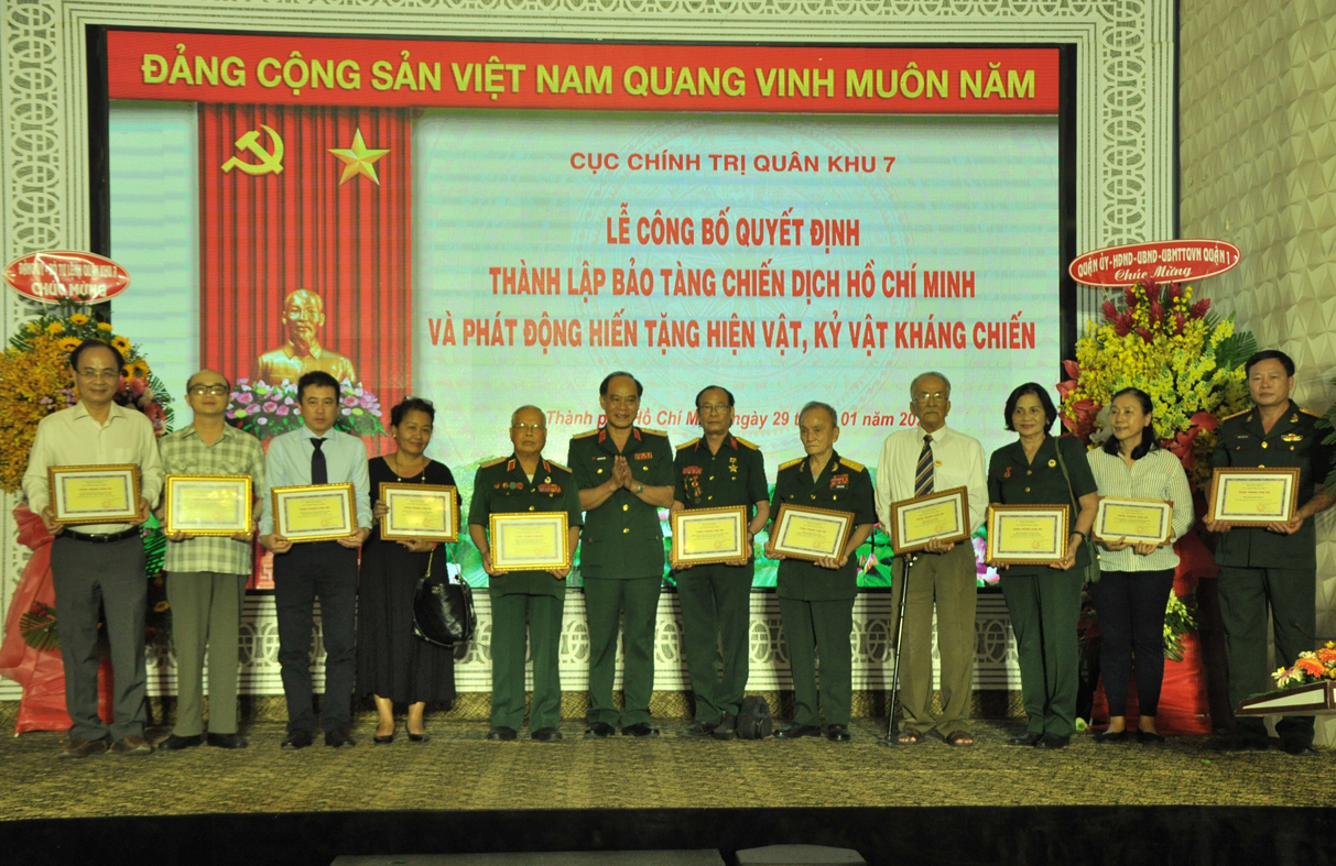 Thiếu tướng Hoàng Đình Chung, Chủ nhiệm Chính trị Quân khu trao thư cảm ơn các đại biểu tặng hiện vật tại Lễ công bố quyết định thành lập Bảo tàng Chiến dịch Hồ Chí Minh. Ảnh: Long Hồ