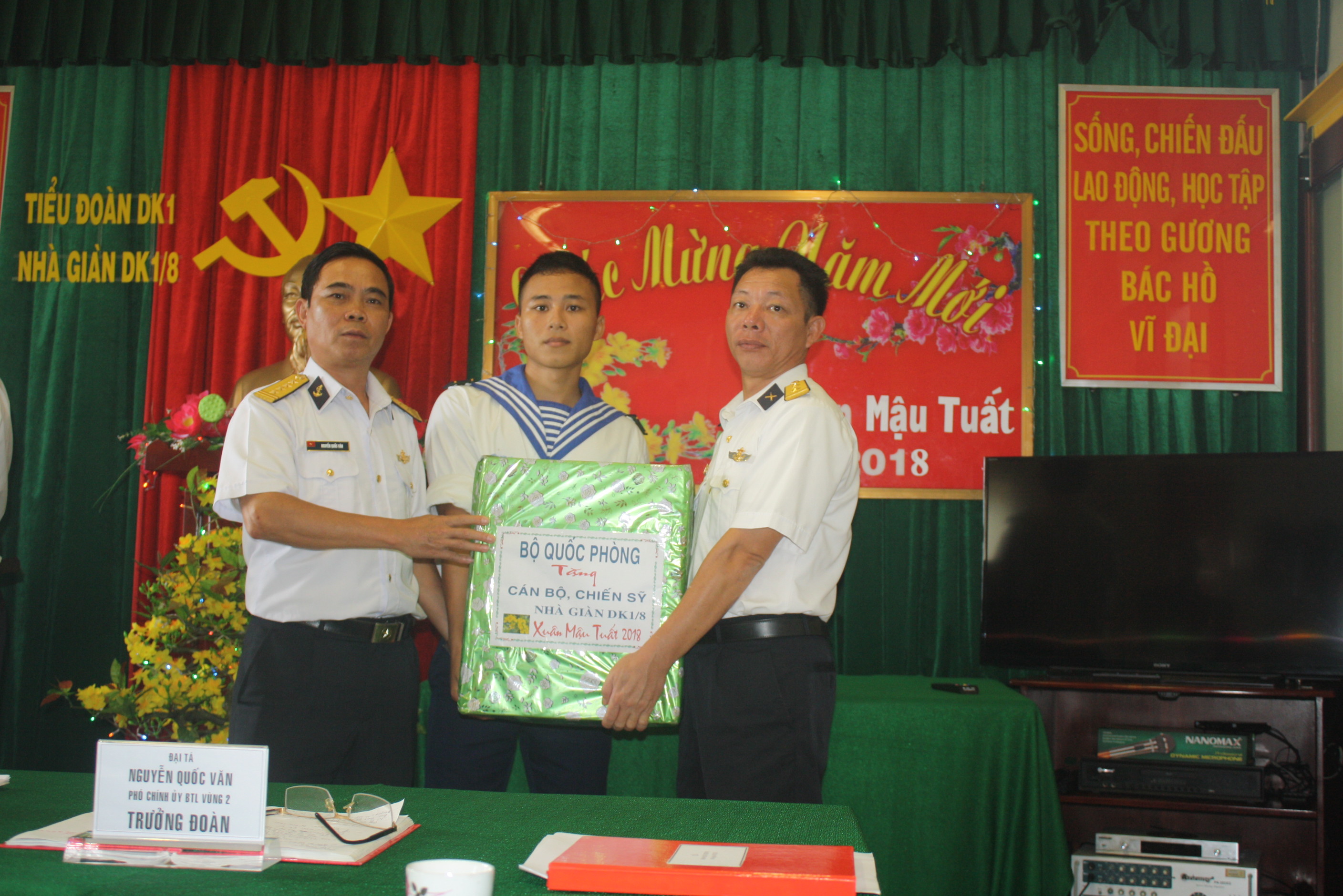 Đại tá Nguyễn Quốc Văn, Phó Chính ủy Vùng 2 hải quân tặng quà cho Nhà giàn DK1/8
