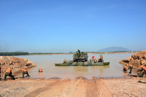 Lữ đoàn Công binh 25 vận chuyển xe tăng của Lữ đoàn Tăng - Thiết giáp 26 vượt sông trong diễn tập