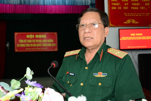 Thiếu tướng Trần Hữu Tài, Phó Chủ nhiệm Chính trị Quân khu 7 phát biểu chỉ đạo tại hội nghị tổng kết công tác thi đua khen thưởng và phong trào thi đua quyết thắng năm 2018 của Khối thi đua 3