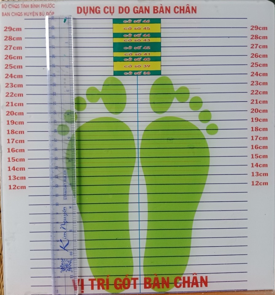 Cấu tạo dụng cụ đo gan bàn chân bao gồm: Bàn đế bằng gỗ chống vỡ, chịu lực và bàn đo bằng mêka có các chỉ số đo. Dụng cụ đo gan bàn chân thiết kế dạng thủ công, dễ sử dụng, đặt trực tiếp bàn chân lên bàn đo, quan sát bằng mắt thường xem chiều dài bàn chân.