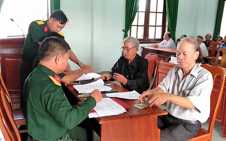Lãnh đạo huyện Cát Tiên trao giấy chứng nhận của Bộ Tư lệnh Quân khu cho các đối tượng tại buổi chi trả chế độ.