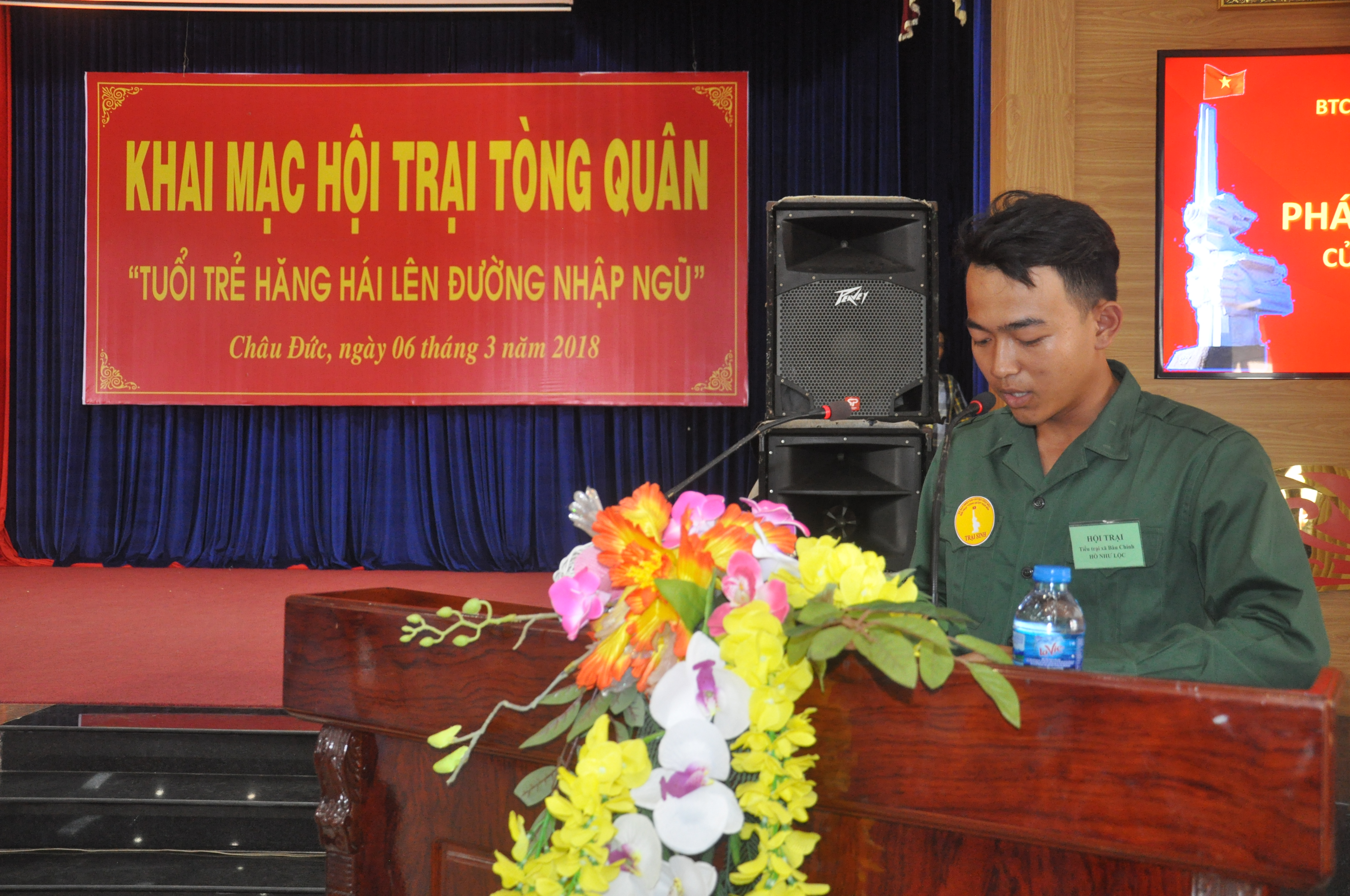 Phát biểu khai mạc hội trại, đồng chí Nguyễn Tấn Bản, Phó Chủ tịch UBND huyện, trưởng ban tổ chức Hội trại tòng quân huyện Châu Đức năm 2018 biểu dương tinh thần sẵn sàng tham gia nhập ngũ của đoàn viên thanh niên đồng thời mong muốn thanh niên huyện Châu Đức tiếp tục phát huy trách nhiệm, tinh thần, nhiệt huyết cách mạng, phấn khởi hăng hái lên đường làm tròn nghĩa vụ bảo vệ Tổ quốc, xác định cho mình lập trường chính trị, tư tưởng vững vàng, ý chí quyết tâm cao, vượt qua mọi khó khăn, ra sức học tập, rèn luyện để trở thành người chiến sĩ gương mẫu trong Quân đội nhân dân Việt Nam anh hùng, xứng đáng với lòng tin yêu của Đảng bộ, chính quyền và nhân dân huyện nhà Châu Đức.
