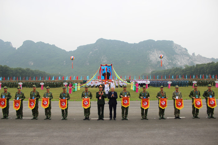 Trung tướng Ngô Minh Tiến tặng cờ cho các đoàn tham gia hội thao.