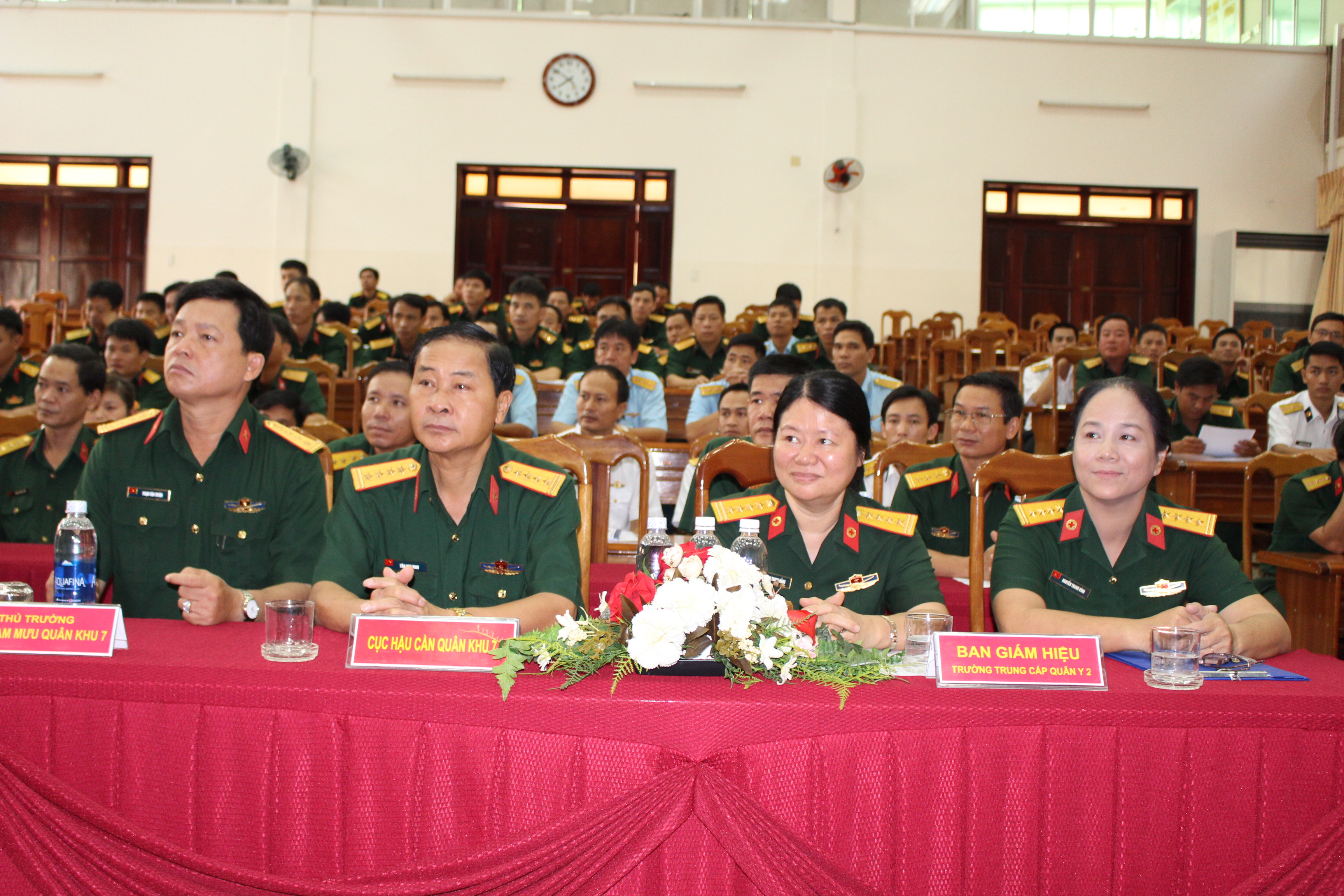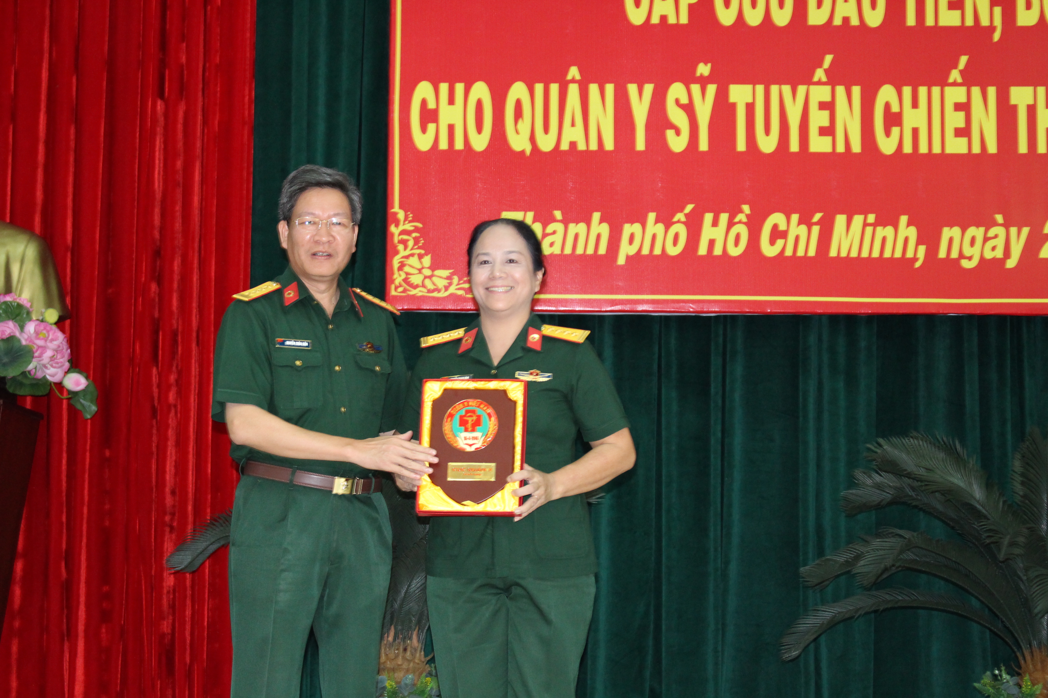 Đại tá, Tiến sỹ Nguyễn Xuân Kiên, Phó Cục trưởng Cục Quân y tặng biểu trưng cho trường Trung cấp Quân y 2