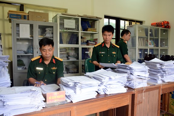 Cán bộ Ban Chính sách (Bộ Chỉ huy Quân sự tỉnh Yên Bái) khẩn trương xử lý số lượng lớn hồ sơ DCHT. (ảnh: QĐND)
