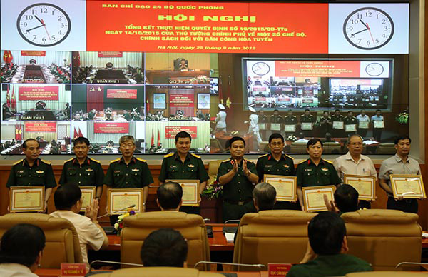 Thượng tướng Lê Chiêm trao Bằng khen của Bộ Quốc phòng tặng các tập thể có thành tích xuất sắc trong tổ chức, thực hiện một số chế độ, chính sách đối với DCHT. (ảnh: Mạnh Hùng)