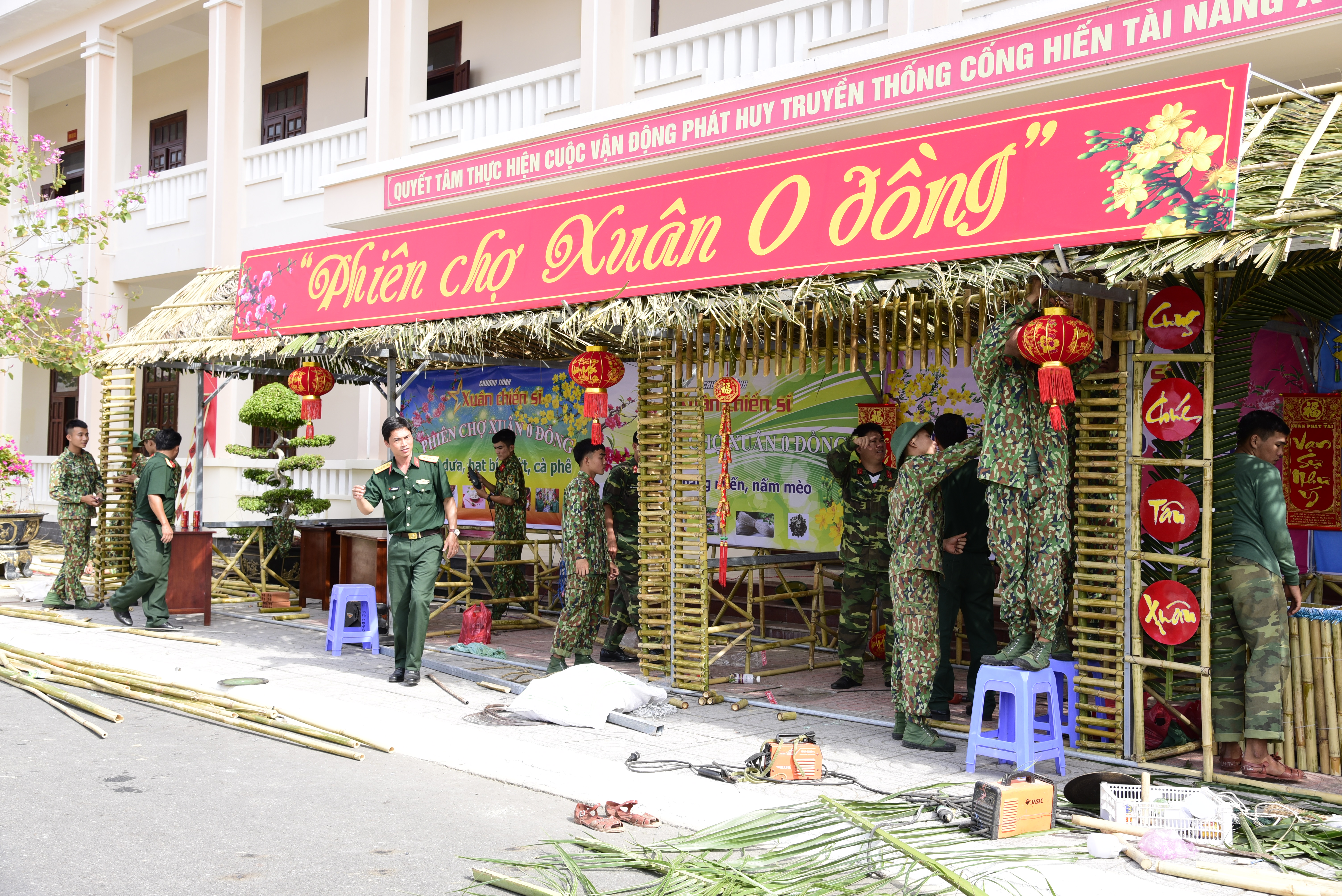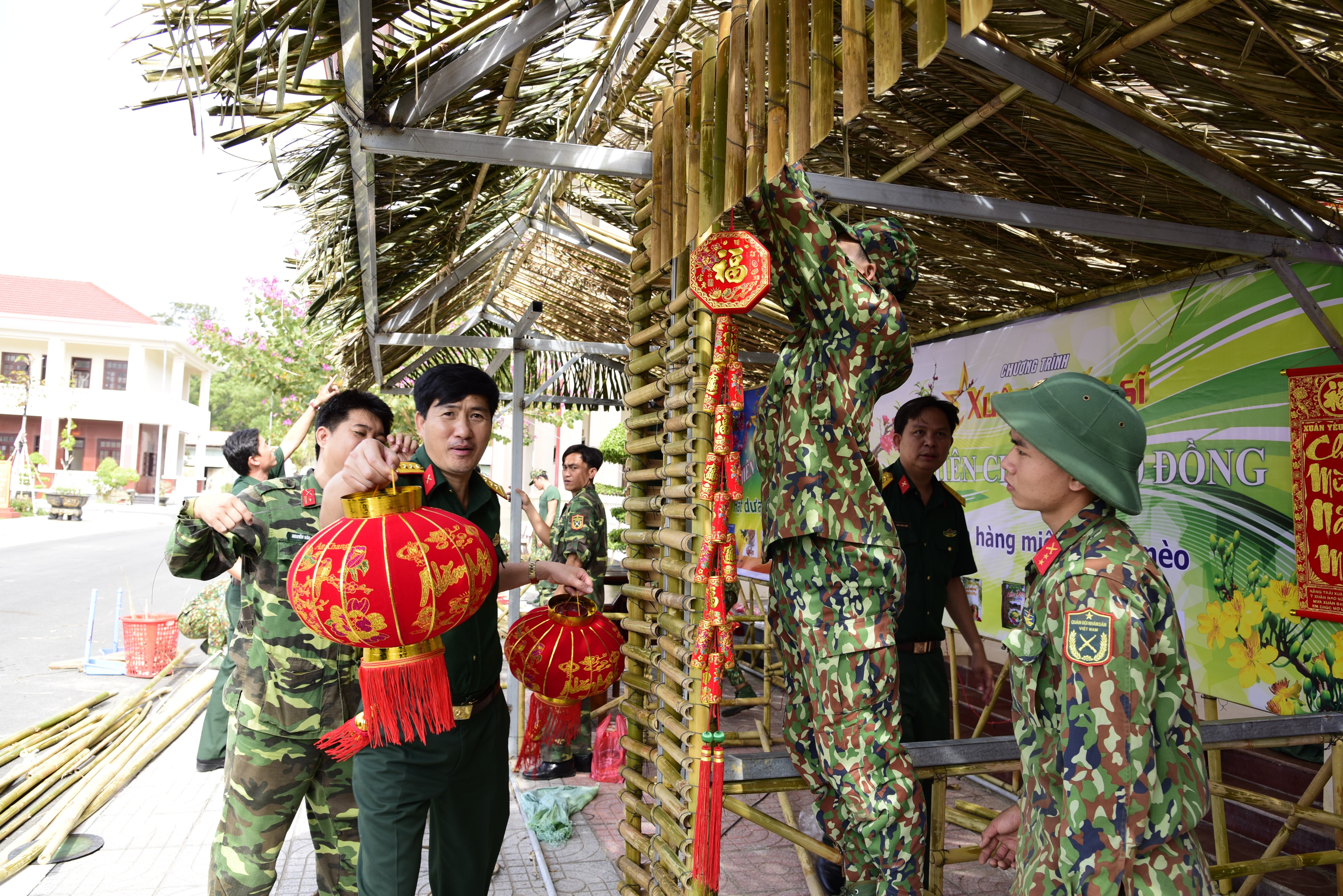 Bộ đội chuẩn bị các gian hàng phục vụ Tết quân - dân.