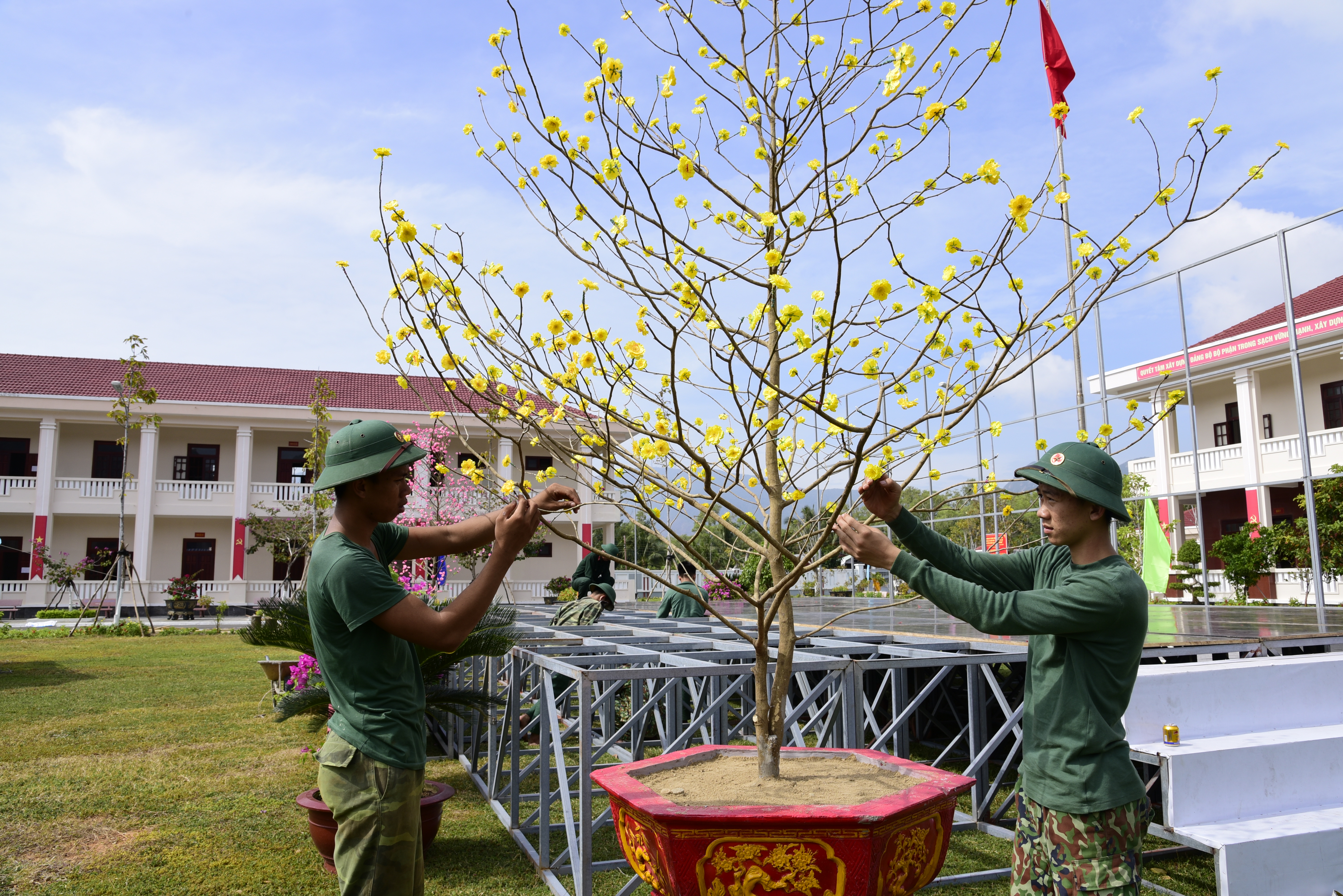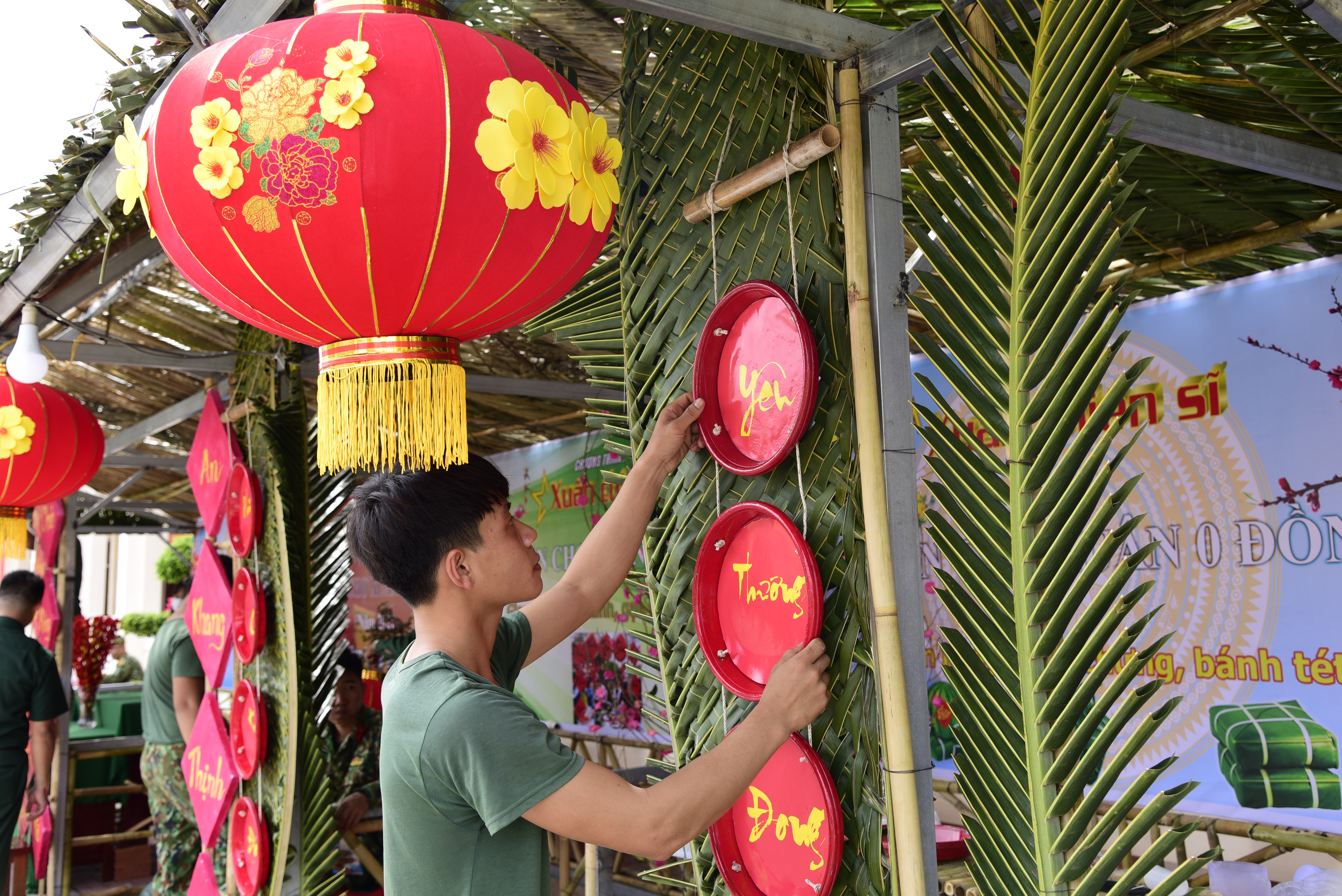 Bộ đội trang trí chuẩn bị cho chương trình Tết quân - dân.