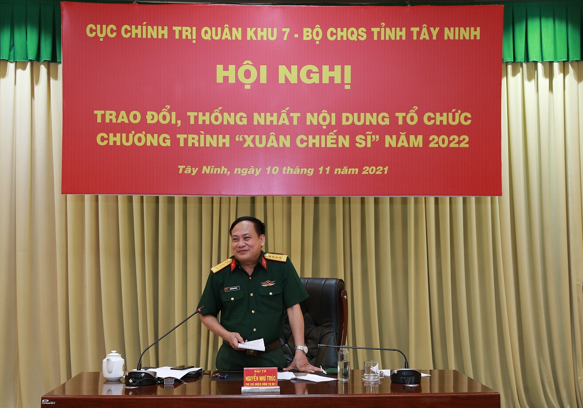 (QK7 Online) – Chiều ngày 10/11, tại Bộ CHQS tỉnh Tây Ninh, Cục Chính trị Quân khu tổ chức hội nghị trao đổi, thống nhất nội dung Chương trình “Xuân Chiến sĩ” năm 2022. Đại tá Nguyễn Như Trúc, Phó Chủ nhiệm Chính trị Quân khu chủ trì hội nghị.