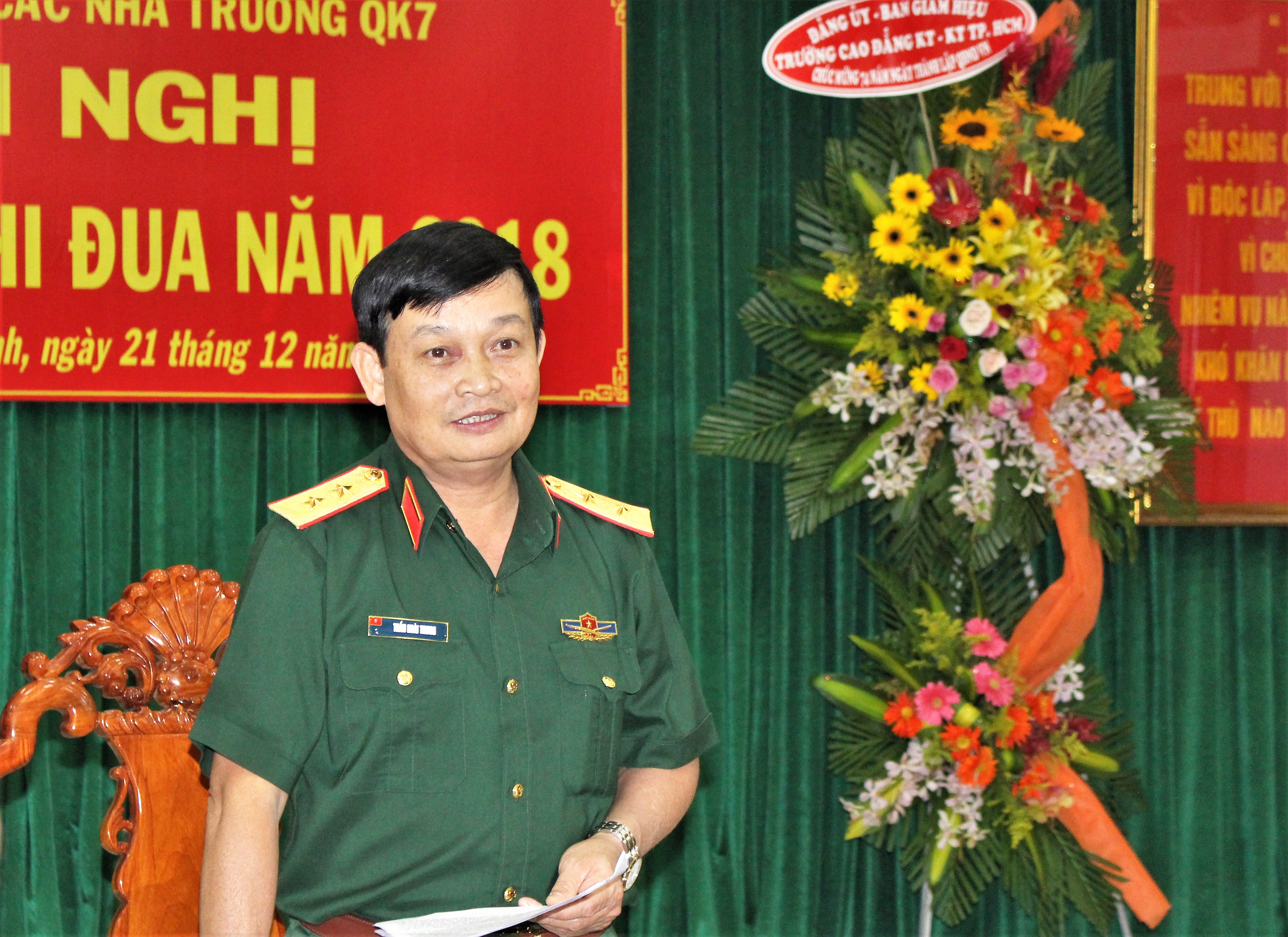 (QK7 Online) - Chiều ngày 21-12-2018 tại Trường Quân sự, Khối thi đua các Nhà trường Quân khu (gồm Trường Quân sự Quân khu, Trường Cao đẳng Quân y 2 và Trường Cao đẳng Nghề số 7) tổ chức Hội nghị tổng kết công tác thi đua năm 2018. Phó Đô đốc Trần Hoài Trung - Bí thư Đảng ủy, Chính ủy Quân khu 7 đến dự.