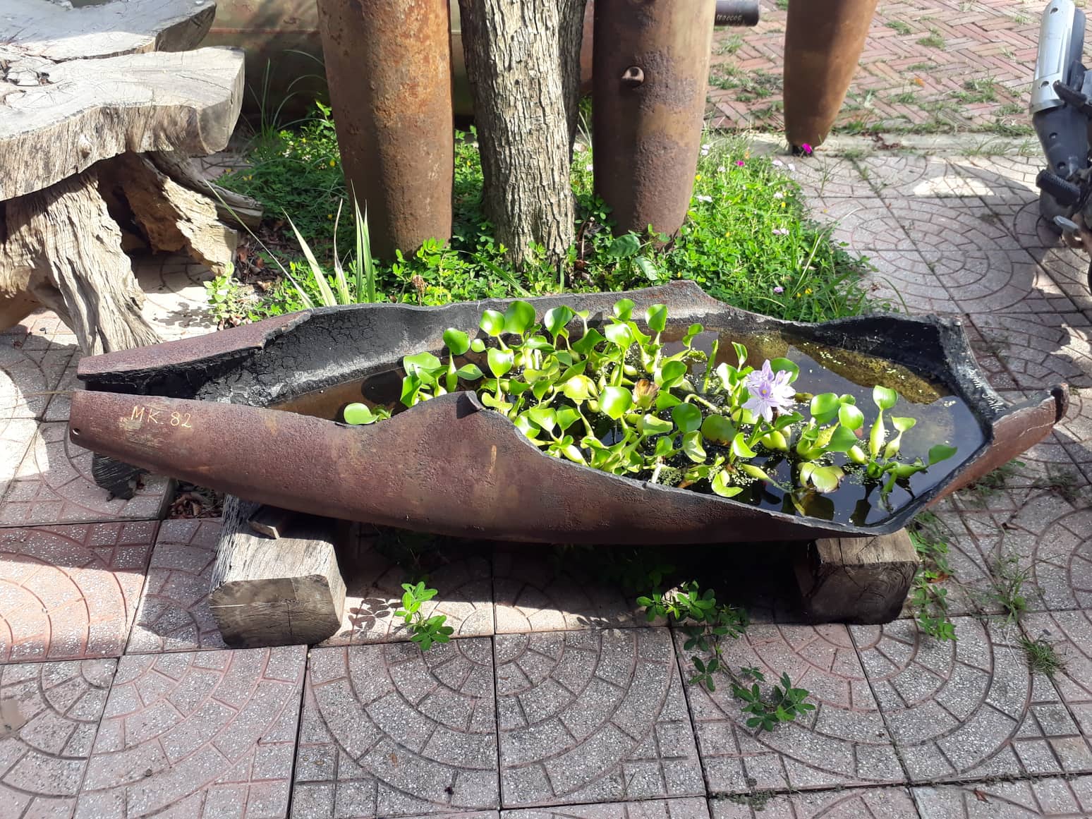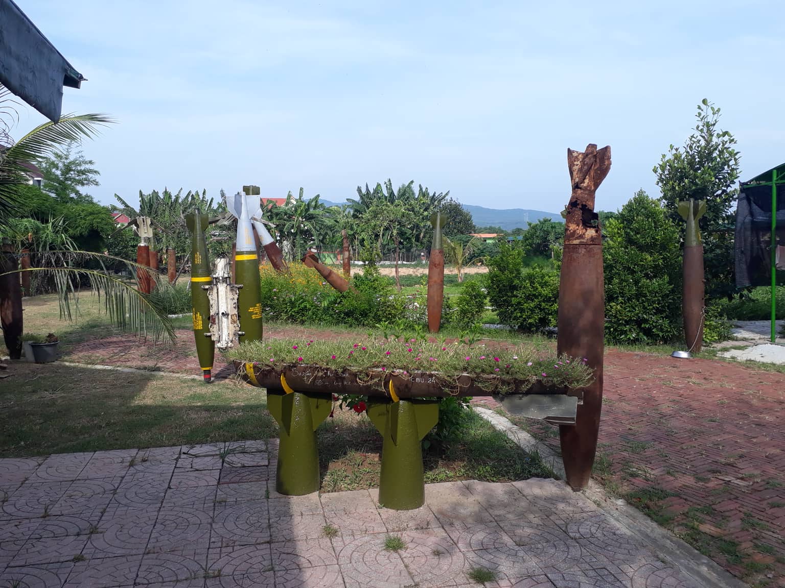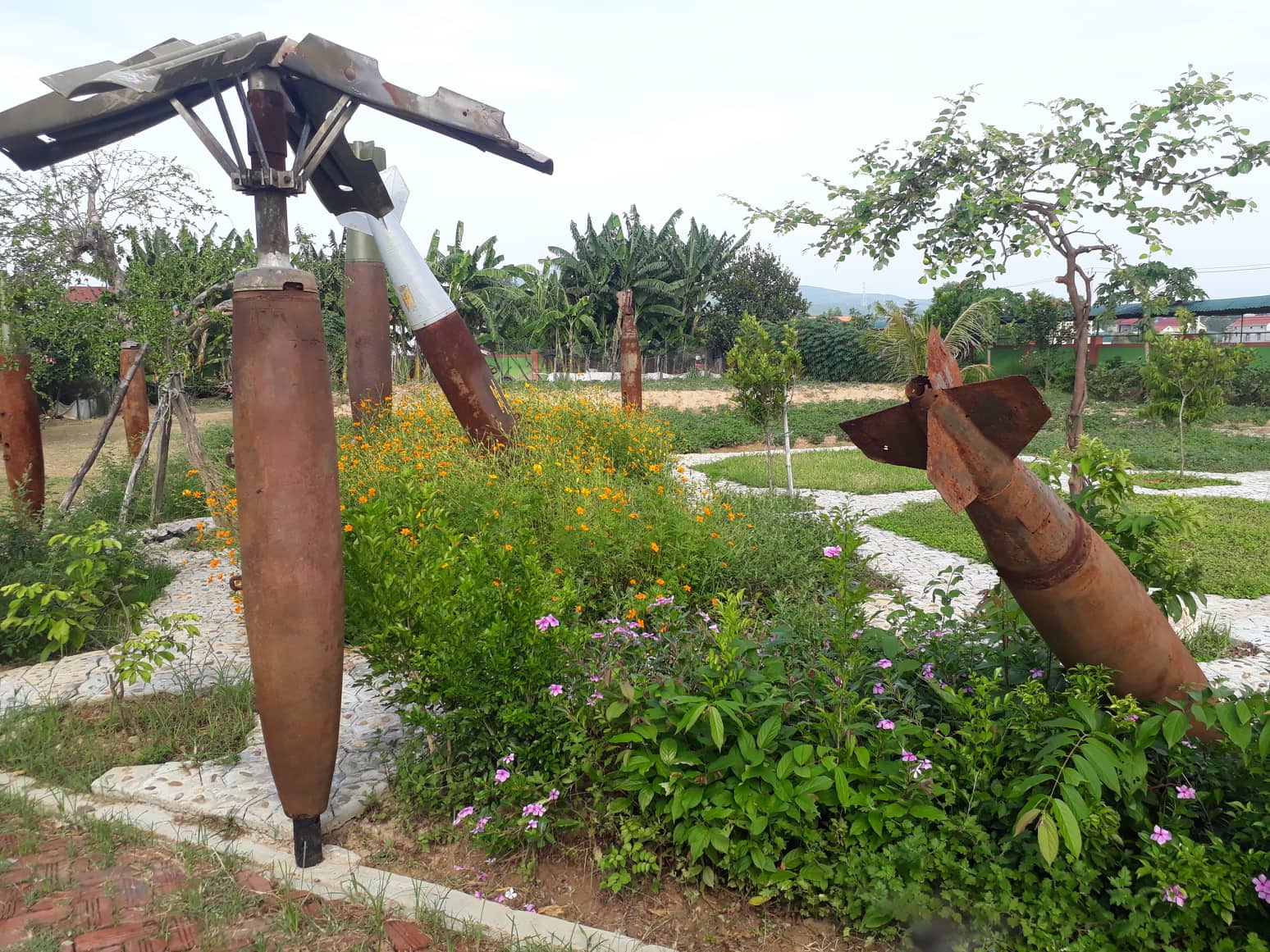 Sau khi có những vỏ bom đạn, anh đưa chúng vào từng vị trí thích hợp rồi đúc bê tông tạo thành trụ gắn kết. Mỗi quả bom được anh Quận lắp trên một chốt sắt gắn với trụ bê tông được chôn sâu xuống đất nên dù cao khoảng 1,5m đến 2m nhưng khi dùng tay đẩy vào quả bom vẫn có thể xoay nghiêng một góc 45 độ mà vẫn đứng vững chãi. Các vỏ bom có thể quay được nhiều hướng khác nhau rất linh động. Từ những vỏ bom, đạn… được anh sáng tạo, chế thành các vật dụng đựng đồ, bồn trồng hoa, cây cảnh làm nên “sự sống hồi sinh trong lòng kẻ hủy diệt”.