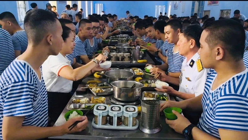 Lãnh đạo UBND phường Tây Nam dùng cơm cùng chỉ huy Lữ đoàn 101 và các tân binh.