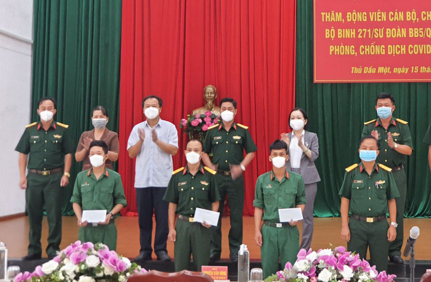 (QK7 Online) - Ngày 15/8, đồng chí Nguyễn Văn Đông, Bí thư Thành ủy thành phố Thủ Dầu Một; đồng chí Nguyễn Thu Cúc, Chủ tịch Ủy ban Nhân dân; đồng chí Võ Thị Bạch Yến, phó Bí thư thường trực, Chủ tịch Hội đồng Nhân dân thành phố Thủ Dầu Một đến thăm, động viên cán bộ, chiến sĩ Trung đoàn 271, Sư đoàn 5 đang tham gia phòng chống dịch trên địa bàn.
