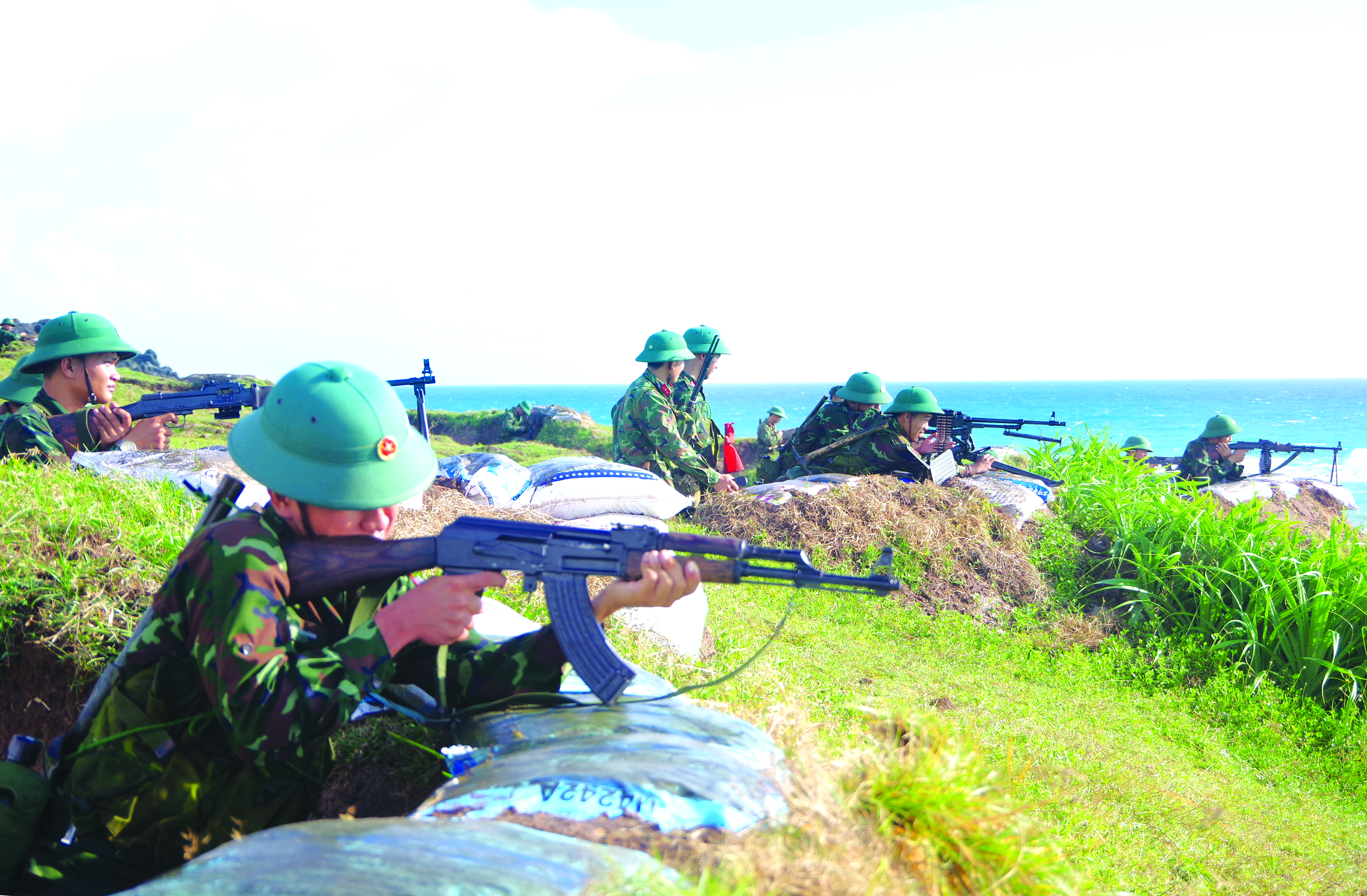 Trong tiếng sóng ầm ào giữa không gian đảo là tiếng chuyển động của binh khí, khẩu lệnh huấn luyện thực hiện nhiệm vụ trực SSCĐ cao điểm Tết. Dựa lưng vào núi là ra đa Hải quân, điểm cao là ra đa phòng không, được ví như “mắt biển giữa trùng khơi” phòng thủ đảo từ sớm, từ xa trên biển và trên không. Bên những sườn núi cheo leo, nắng gió thổi quanh năm luôn thường trực những đôi mắt của các chiến sĩ pháo binh, phòng không, bộ binh. Các anh luôn chắc tay súng sẵn sàng chiến đấu bảo vệ đảo.