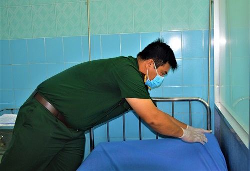 Trung úy CN Võ Thanh Mơ dọn dẹp, chuẩn bị phòng nghỉ đón người cách ly.