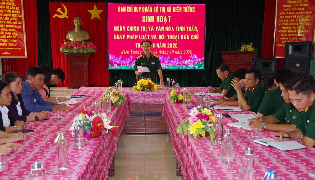 (QK7 Online) - Ngày 1/10, Ban Chỉ huy Quân sự thị xã Kiến Tường tổ chức sinh hoạt ngày Chính trị, văn hóa tinh thần, ngày Pháp luật và đối thoại dân chủ tháng 10 năm 2020 cho hơn 40 cán bộ, chiến sĩ trong toàn đơn vị.