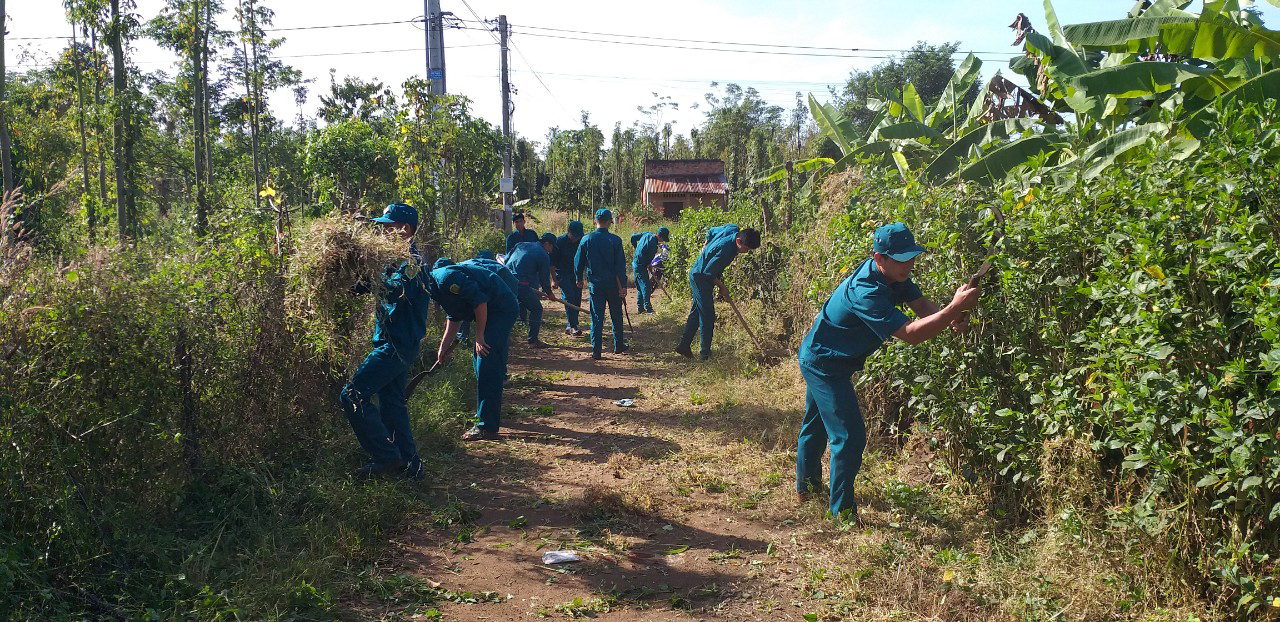 Cán bộ, chiến sĩ LLVT  tỉnh tham gia dọn dẹp vệ sinh, phát quang các tuyến đường liên thôn xã Bàu Chinh, huyện Châu Đức.