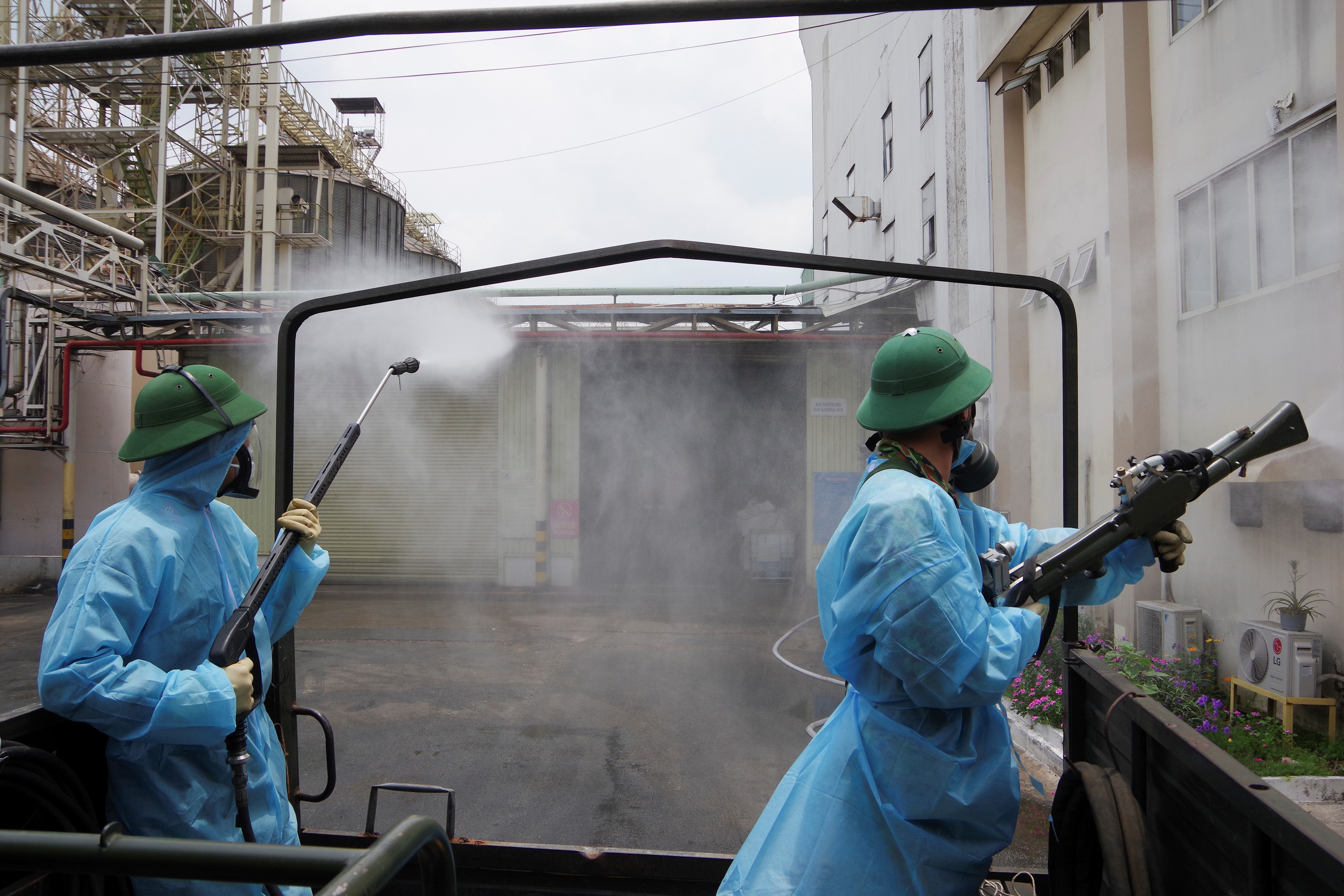 Đơn vị huy động 15 cán bộ, chiến sĩ, 2 xe chuyên dụng cùng 75kg hóa chất Cloramin B tiến hành phun khử khuẩn tại các nhà xưởng, trục đường nội bộ, khu ở tập trung của công ty với diện tích trên 5ha.