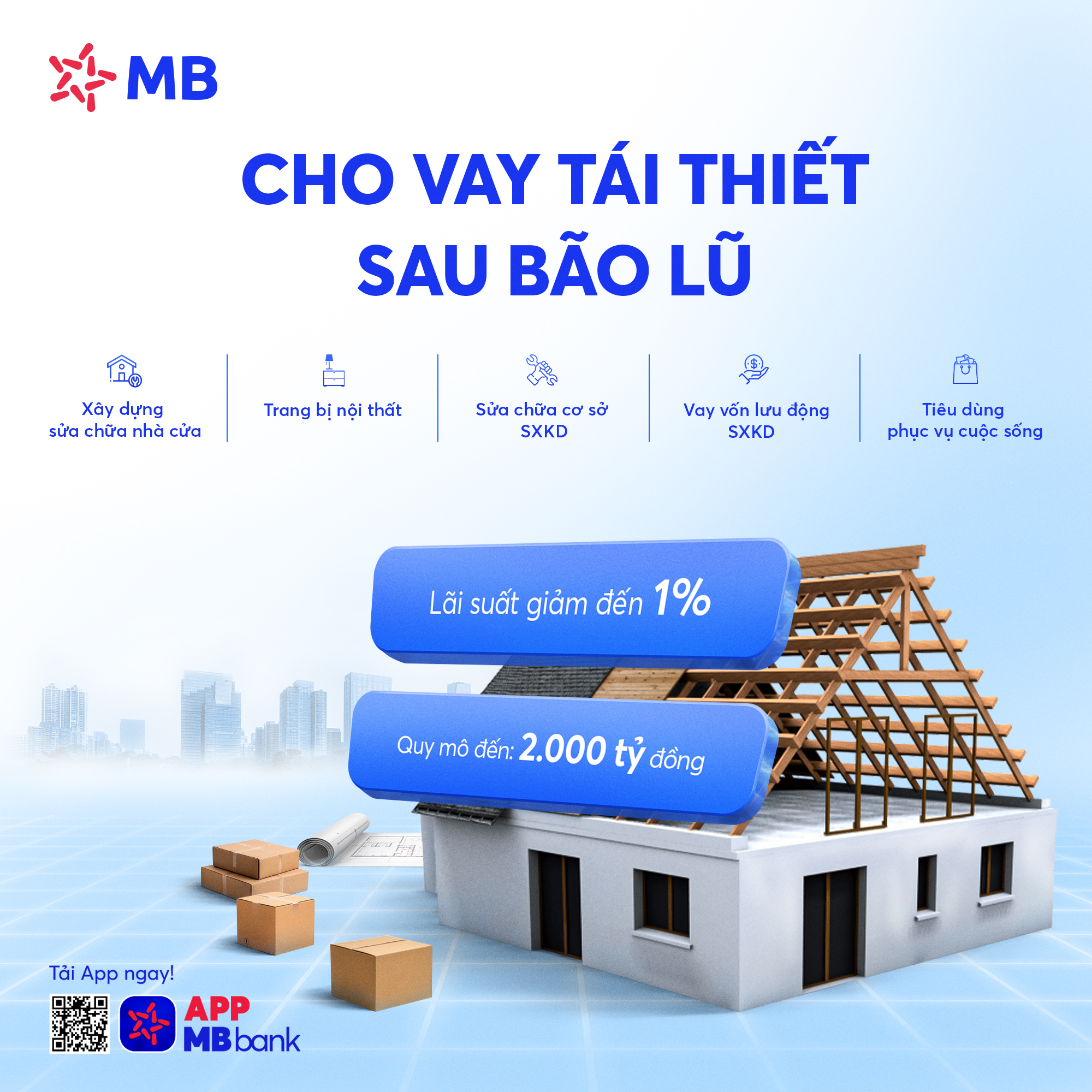 Ngoài ra, MB còn triển khai gói vay ưu đãi đặc biệt đến 2.000 tỷ đồng với lãi suất cho vay giảm tới 1% một năm cho các khách hàng có nhu cầu vay vốn từ nay đến hết 31/12/2024 nhằm tạo điều kiện cho người dân có thể tiếp cận nguồn vốn tốt tái thiết lại cuộc sống sau bão lũ với nhiều mục đích như: Sửa chữa lại nhà cửa, mua sắm trang bị nội thất, sửa chữa cơ sở kinh doanh và cấp thêm vốn ổn định sản xuất, vay tiêu dùng để ổn định cuộc sống. Đồng thời, ngân hàng cũng hỗ trợ đa dạng hình thức cấp tín dụng như khoản vay, thấu chi, bảo lãnh, thẻ tín dụng... giúp người dân linh hoạt sử dụng vốn theo nhu cầu.