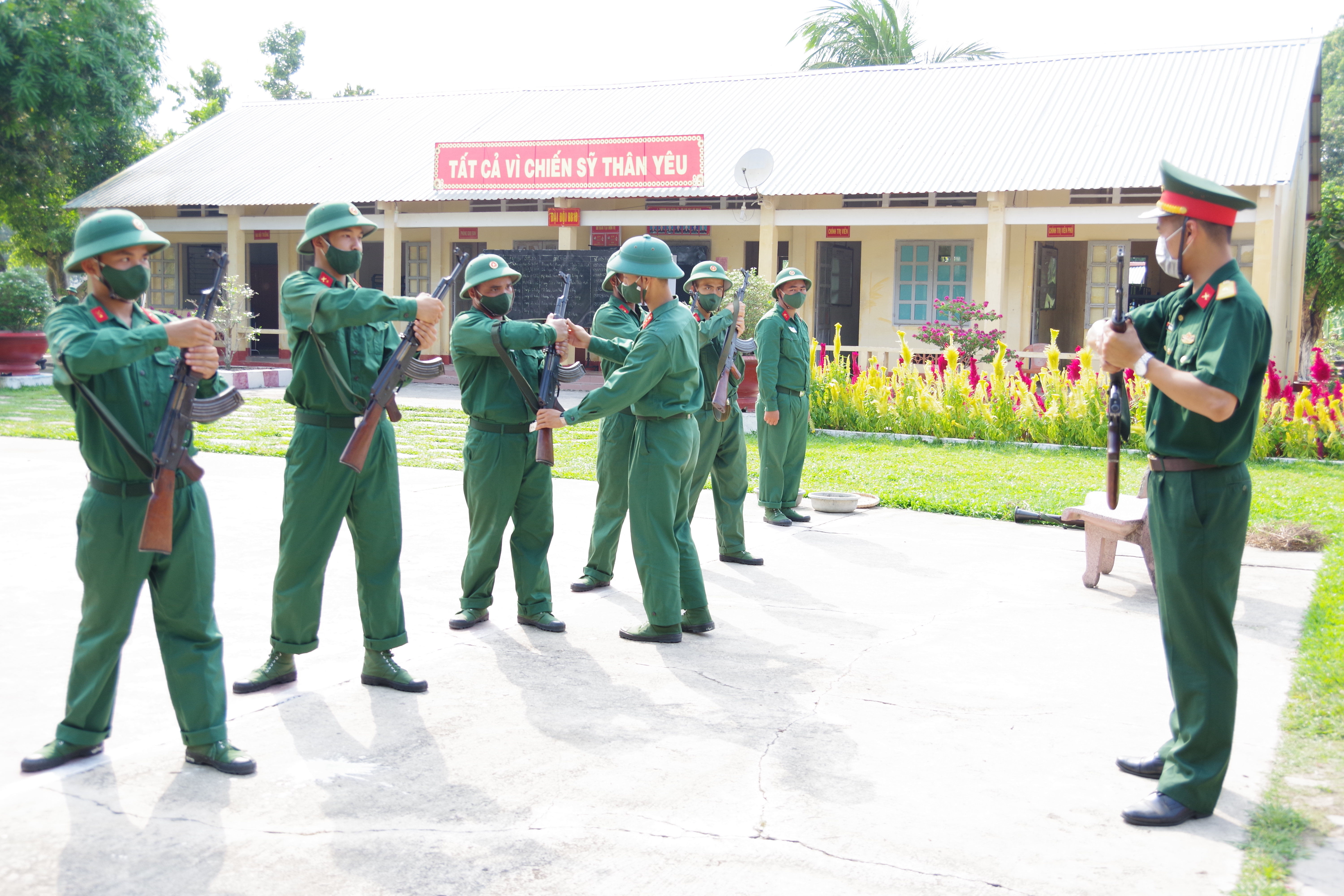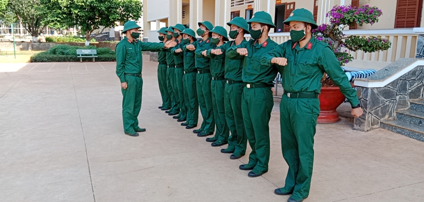 Tiểu đội trưởng hướng dẫn chiến sĩ mới học điều lệnh đội ngũ.