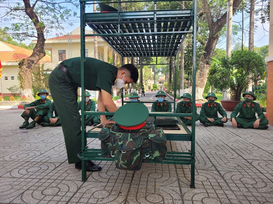 Cán bộ hướng dẫn chiến sĩ mới sắp xếp nội vụ.