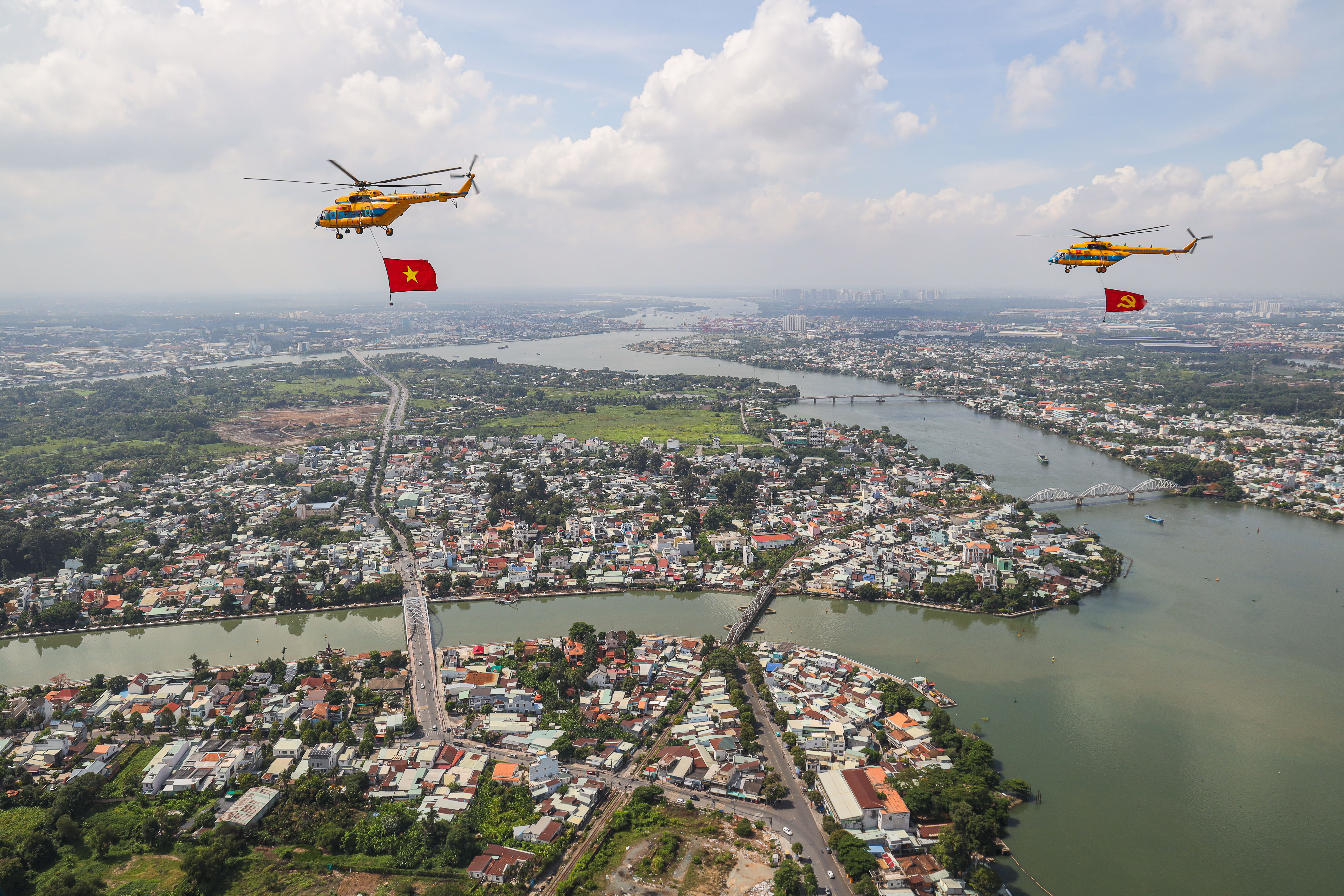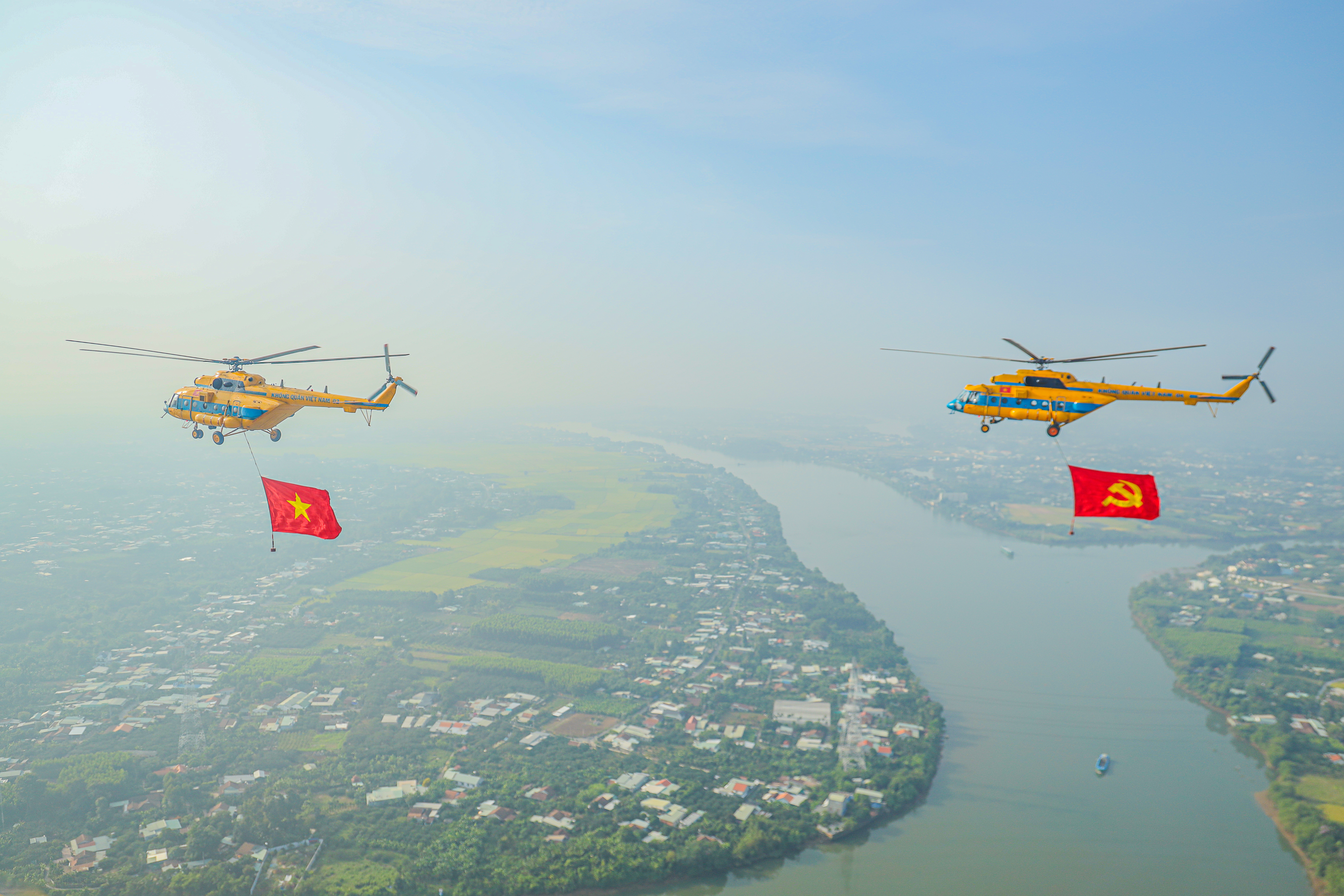 Biên đội trực thăng treo cờ Đảng, cờ Tổ quốc bay qua dòng sông và cánh đồng xanh tại Đồng Nai.
