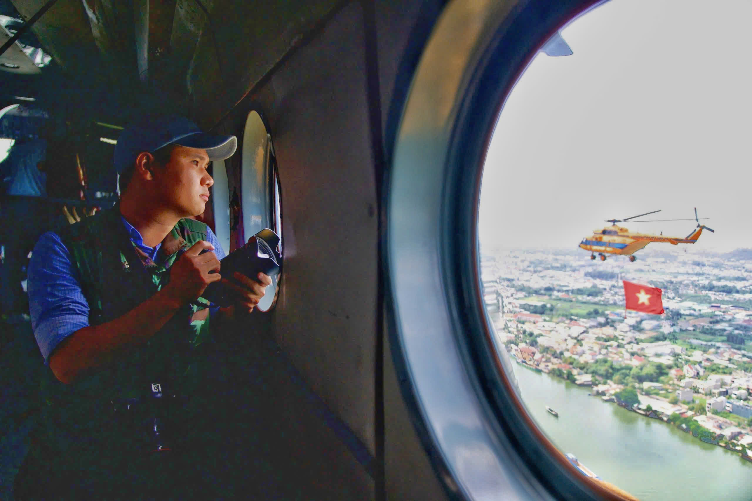 Phóng viên báo Quân khu 7 tác nghiệp trên trực thăng.