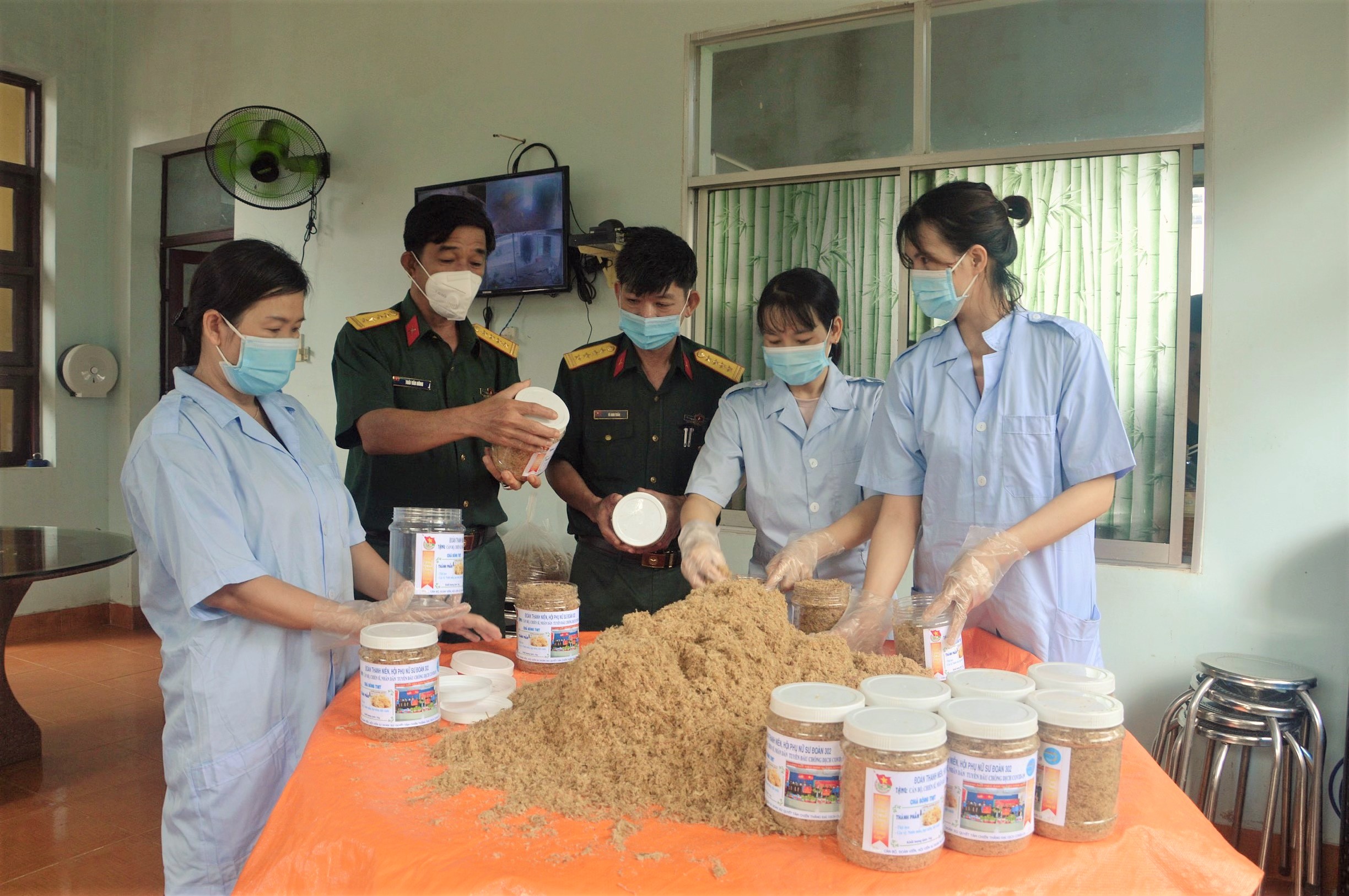 Đại úy Đặng Thị Mai Xuân, Chủ tịch Hội Phụ nữ sư đoàn chia sẻ: “Để có được số lượng chà bông và thịt hộp trên, sư đoàn hỗ trợ đoàn thanh niên, Hội phụ nữ gần 500kg thịt heo từ sản phẩm chăn nuôi của đơn vị; kinh phí bảo đảm mua gia vị, hũ đựng chà bông, thịt hộp được các cơ quan, đơn vị ủng hộ và trích một phần từ kinh phí hoạt động hội. Đây là những phần quà gửi đến cán bộ, chiến sĩ sư đoàn trên tuyến đầu chống dịch, bảo đảm sức khỏe bộ đội hoàn thành tốt nhiệm vụ được giao”.