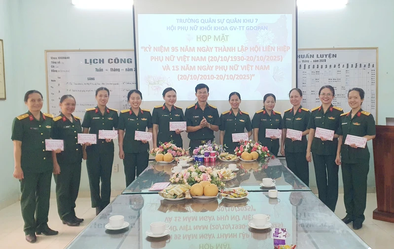 (QK7 Online) - Ngày 17 tháng 10, Cục Chính trị Quân khu tổ chức gặp mặt kỷ niệm 95 năm Ngày thành lập Hội Liên hiệp Phụ nữ Việt Nam (20/10/1930 – 20/10/2025) và 15 năm Ngày Phụ nữ Việt Nam (20/10/2010 – 20/10/2025). Dự họp mặt có Thiếu tướng Phạm Anh Tuấn, Ủy viên Ban Thường vụ Đảng ủy Quân khu, Chủ nhiệm Chính trị Quân khu cùng phu nhân; Thiếu tướng Trần Đức Thắng, Bí thư Đảng ủy Cục Chính trị, Phó Chủ nhiệm Chính trị Quân khu dự và phát biểu chúc mừng.