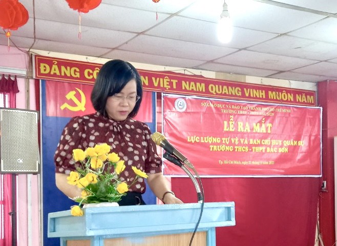 Phát biểu tại buổi lễ, đồng chí Võ Thị Chính, Phó Chủ tịch UBND Quận 12 cho biết, Trường THCS - THPT Bắc Sơn là đơn vị giáo dục ngoài công lập đầu tiên trên địa bàn quận thành lập, ra mắt lực lượng tự vệ và Ban Chỉ huy quân sự tại trường. Đồng thời chí nhấn mạnh, nhiệm vụ của Ban CHQS và Tiểu đội tự vệ là tham mưu cho lãnh đạo nhà trường chỉ đạo thực hiện công tác quân sự, quốc phòng, không ngừng nâng cao chất lượng hoạt động và sẵn sàng chiến đấu nhằm giữ gìn an ninh chính trị, trật tự an toàn xã hội trên địa bàn, cũng như bảo vệ tài sản, phòng chống thiên tai, dịch bệnh, phòng chống cháy nổ, đảm bảo sự ổn định và phát triển của trường, đem đến cho giáo viên, nhân viên và học sinh trường môi trường làm việc và học tập bình yên, ổn định, góp phần nâng cao chất lượng bảo vệ Tổ quốc, xây dựng đất nước phát triển bền vững.