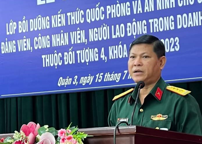 Thượng tá Nguyễn Duy Trung, Chỉ huy trưởng Ban Chỉ huy Quân sự Quận 3 phát biểu tại lớp bồi dưỡng.