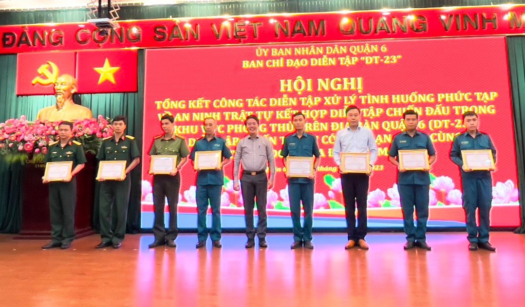 Lãnh đạo Quận 6 trao khen thưởng cho các tập thể hoàn thành tốt nhiệm vụ diễn tập năm 2023.