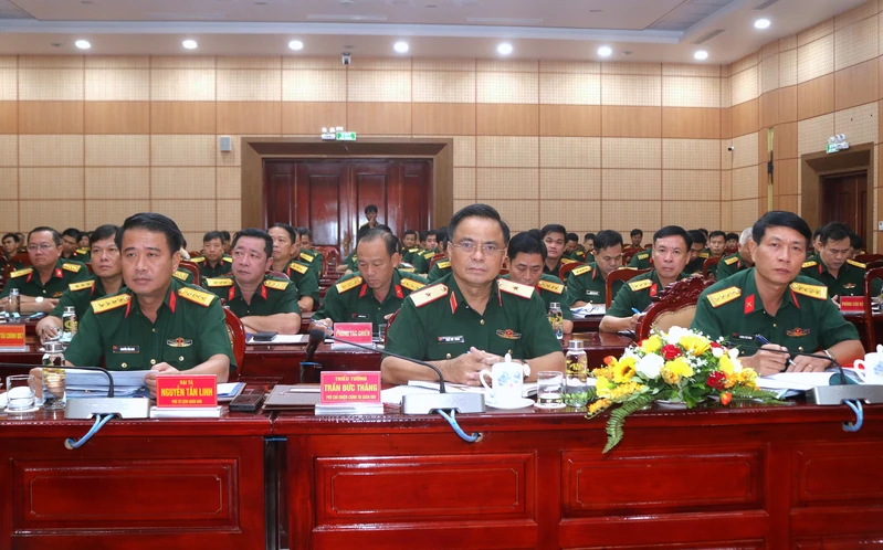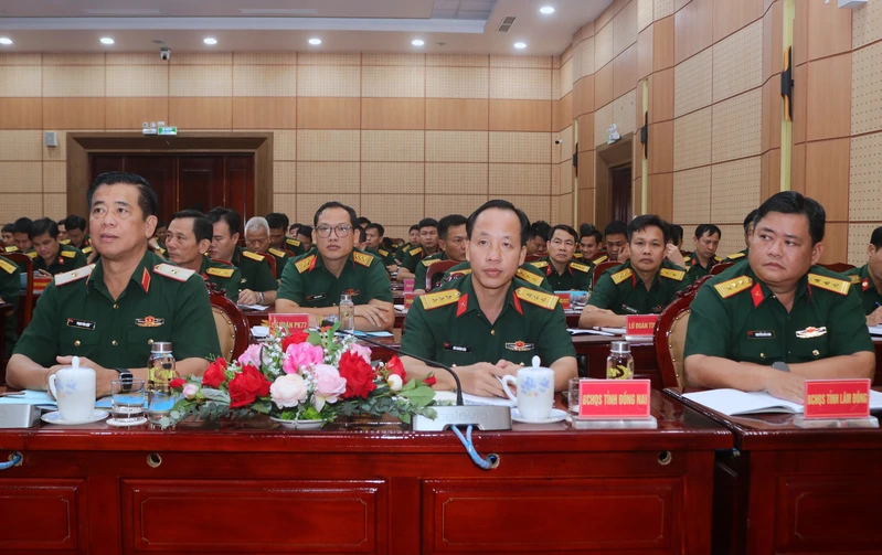 Thiếu tướng Phạm Văn Rậm, Phó Tư lệnh Bộ Tư lệnh TPHCM (bìa trái) và đại biểu dự hội nghị.