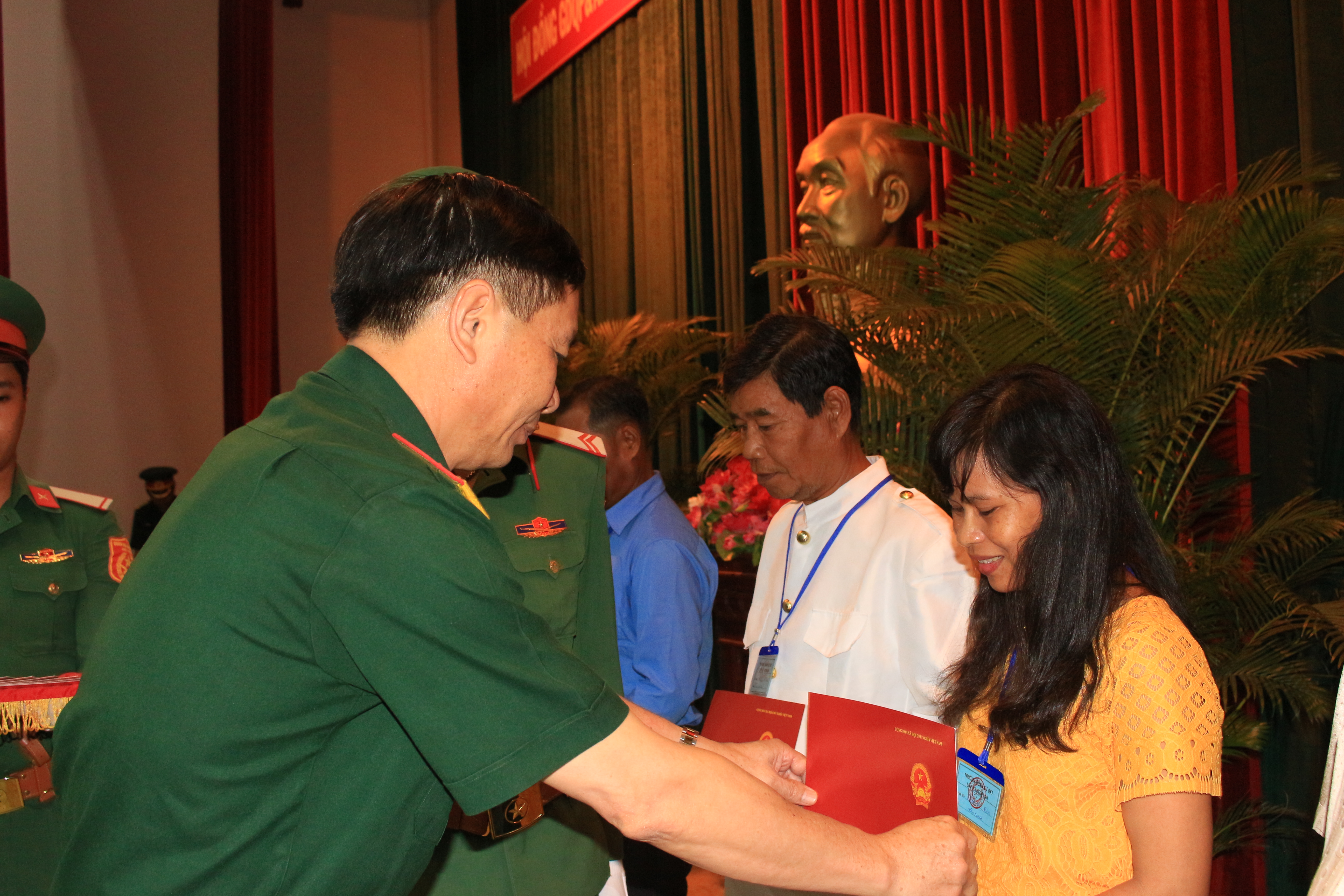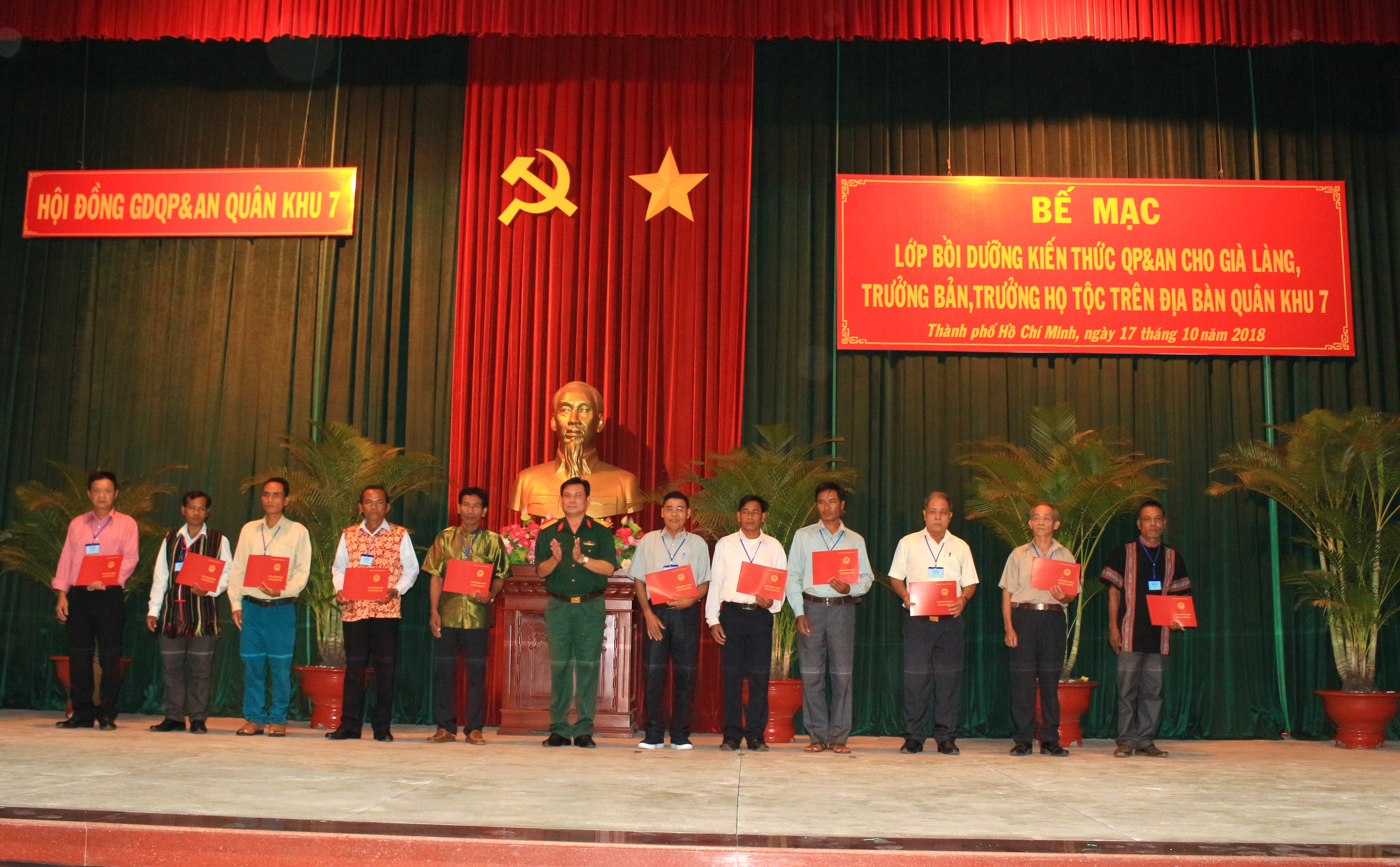 Ban giám hiệu trường Quân sự Quân khu trao giấy chứng nhận cho các học viên hoàn thành lớp học