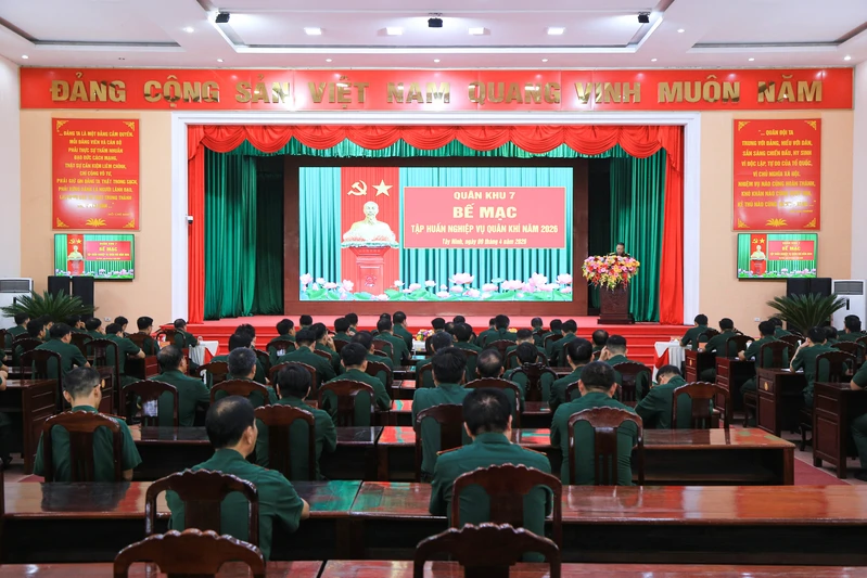 (QK7 Online) - Ngày 6/4, tại Trường Quân sự Quân khu, Quân khu 7 tổ chức khai mạc lớp tập huấn kiến thức quân sự, quốc phòng địa phương cho Chỉ huy trưởng, Chính trị viên phó Ban CHQS xã, phường, đặc khu trong LLVT Quân khu năm 2026. Đại tá Trần Hữu Nhân, Phó Tham mưu trưởng Quân khu chủ trì buổi khai mạc tập huấn.