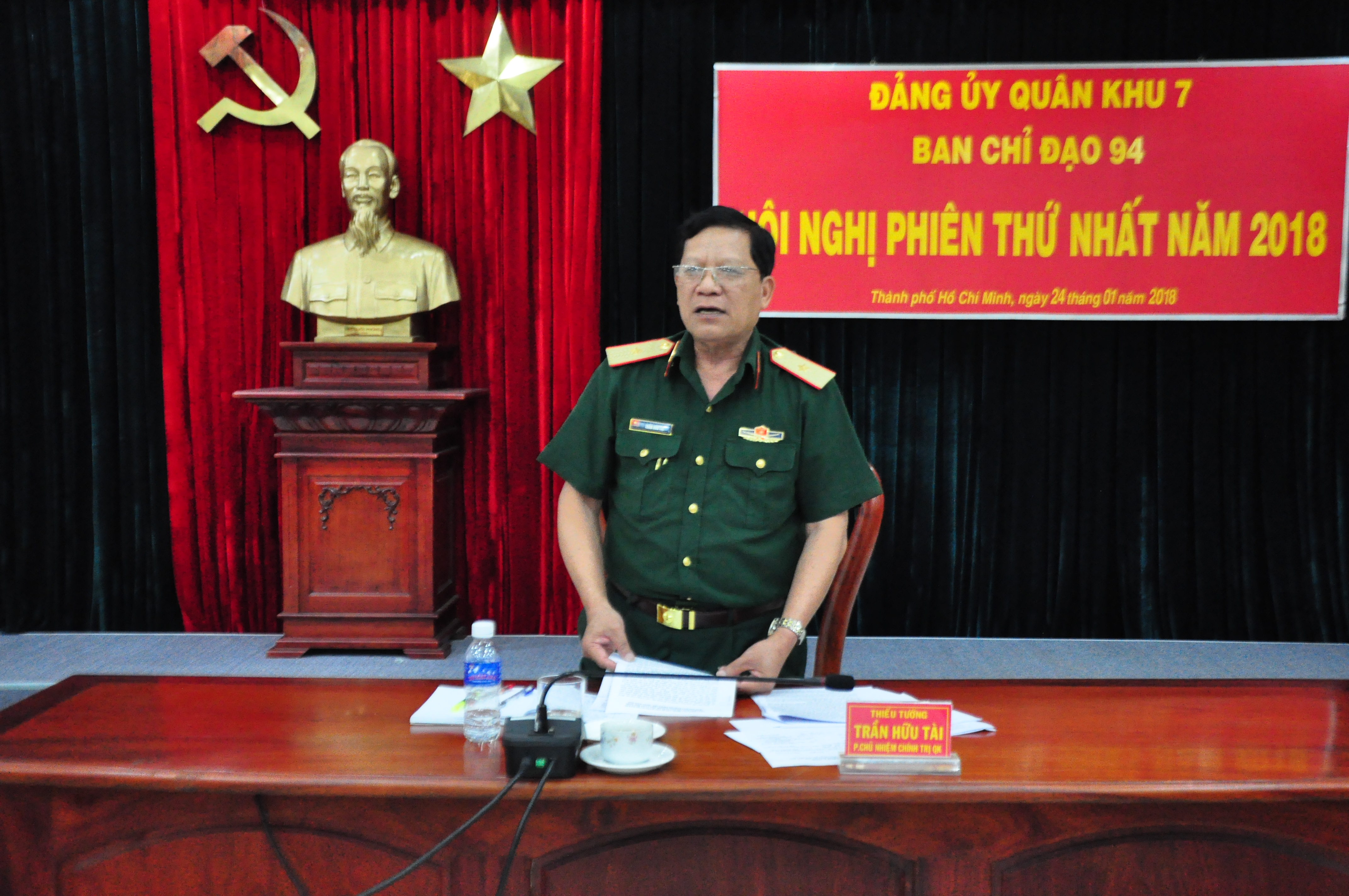 (QK7 Online) - Chiều 24/1, tại thành phố Hồ Chí Minh, Ban Chỉ đạo phòng, chống “diễn biến hòa bình” trên lĩnh vực tư tưởng, văn hóa của Đảng ủy Quân khu 7 (Ban Chỉ đạo 94 Đảng ủy Quân khu 7) tổ chức hội nghị tổng kết năm 2017, triển khai nhiệm vụ năm 2018. Thiếu tướng Trần Hữu Tài, Phó Chủ nhiệm Chính trị Quân khu 7, Phó trưởng Ban chỉ đạo 94 Đảng ủy Quân khu 7 chủ trì hội nghị.