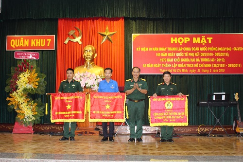 (QK7 Online) - Chiều ngày 21 tháng 3, Quân khu 7 tổ chức họp mặt khối hoạt động công tác quần chúng trong toàn LLVT Quân khu nhân dịp kỷ niệm 70 năm Ngày thành lập Công đoàn Quốc phòng; 109 năm Ngày Quốc tế Phụ nữ, 1979 năm Khởi nghĩa Hai Bà Trưng; 88 năm Ngày thành lập Đoàn TNCS Hồ Chí Minh.