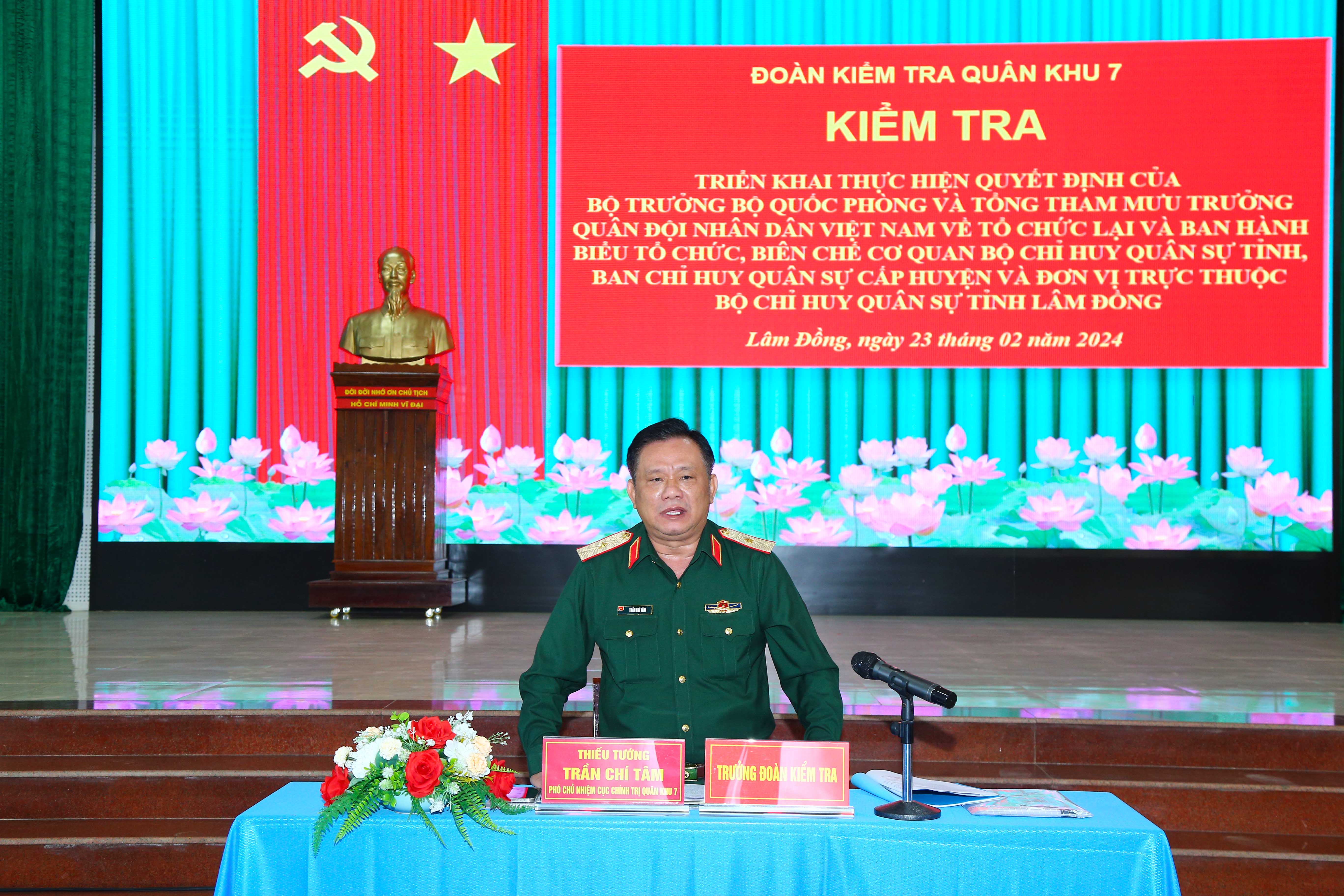 Kết luận kiểm tra, Thiếu tướng Trần Chí Tâm đề nghị Bộ CHQS tỉnh Lâm Đồng và các cơ quan, đơn vị tiếp thu, chỉnh sửa và bổ sung những ý kiến đóng góp mà đoàn đã chỉ ra; phân chia nhân sự về cơ quan, đơn vị phù hợp với chức danh, nhiệm vụ; làm tốt công tác tư tưởng, tổ chức kết hợp thường xuyên quan tâm, động viên, nắm bắt tâm tư tình cảm cũng như giải quyết chế độ chính sách cho cán bộ, chiến sĩ sau khi thực hiện sáp nhập, điều chỉnh tổ chức, biên chế mới...