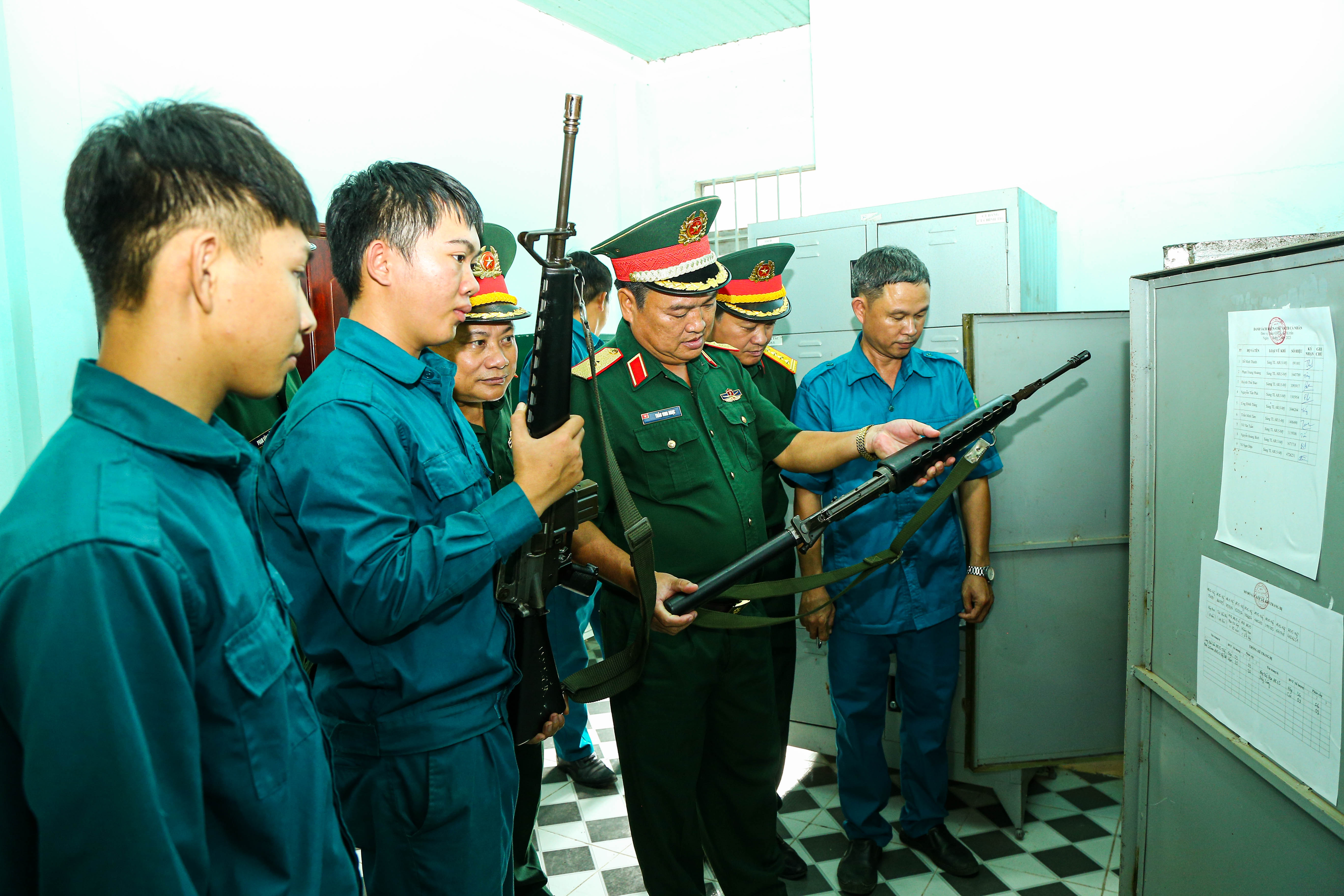 Thiếu tướng Trần Vinh Ngọc, Phó Chính ủy Quân khu và đoàn công tác kiểm tra công tác bảo quản, bảo dưỡng vũ khí Ban CHQS thị trấn Tân Nghĩa.