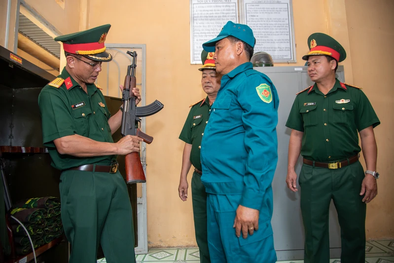 Đồng chí Phó Tham mưu trưởng Quân khu kiểm tra vũ khí, trang bị của Chốt dân quân biên giới Mỹ Quý, Ban chỉ huy quân sự xã Mỹ Qúy..