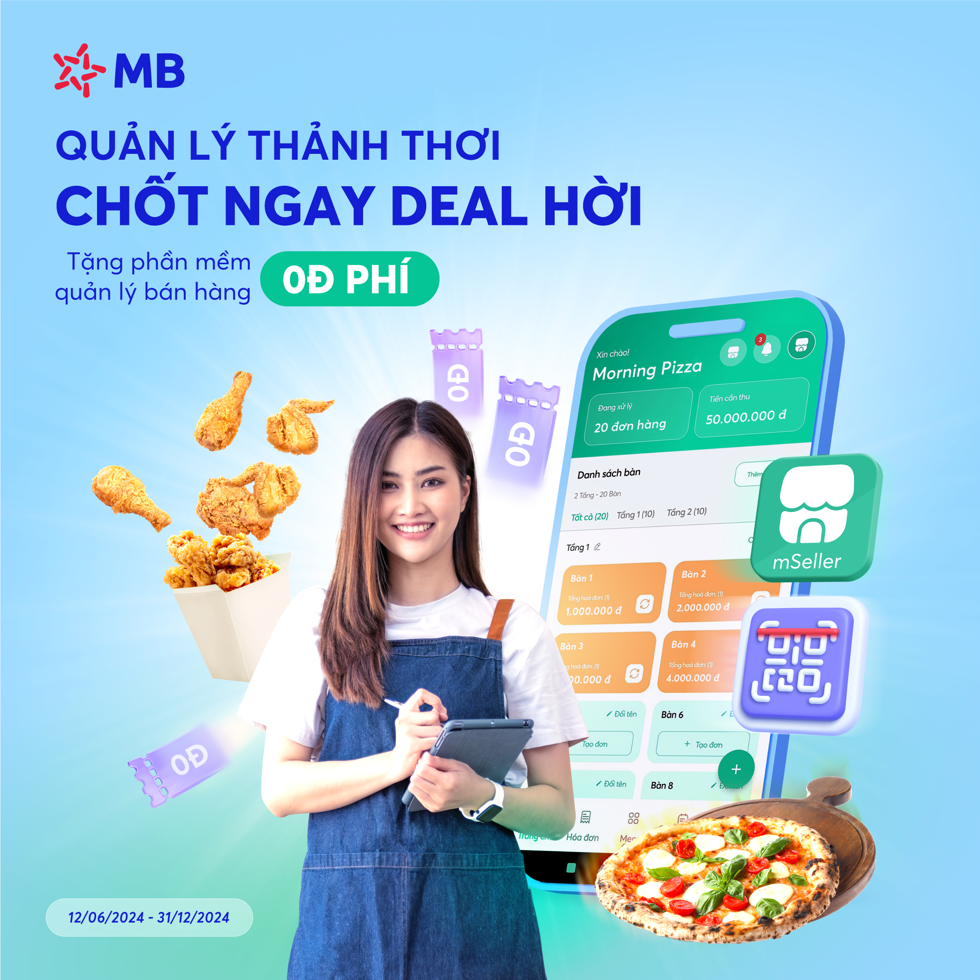 (QK7 Online) - Từ ngày 12/6, MB triển khai chương trình khuyến mại “Quản lý thảnh thơi - Chốt ngay deal hời” - tặng Phần mềm quản lý bán hàng mSeller dành riêng với khách hàng kinh doanh FnB, có sử dụng tài khoản thanh toán VietQR tại MB.