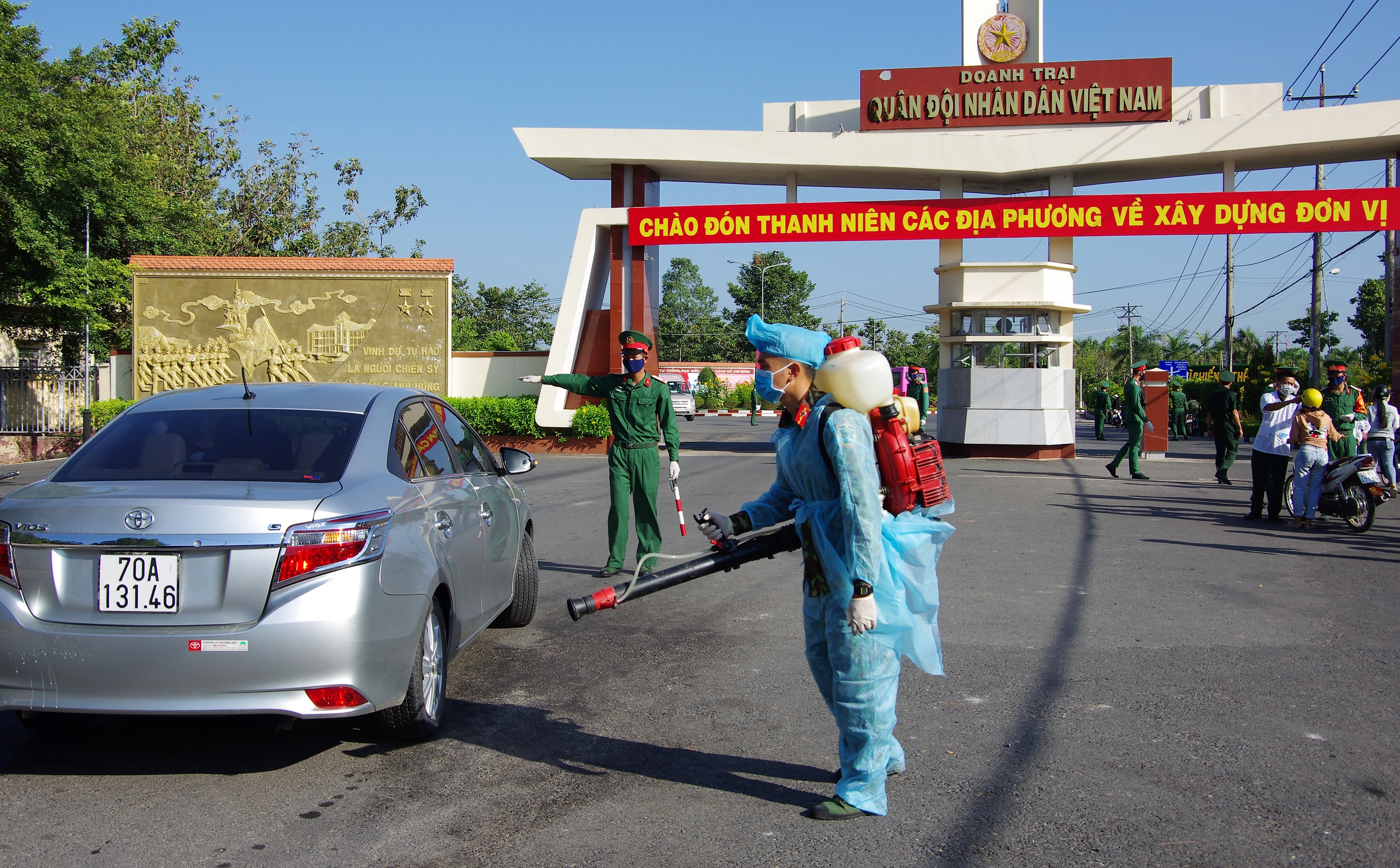 Phun thuốc khử trùng phương tiện vào doanh trại.
